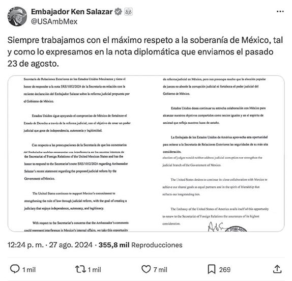 Como lo expresó el embajador Salazar, Estados Unidos apoya el concepto de Reforma Judicial en México, pero nos preocupa mucho que la elección popular de jueces no aborde la corrupción judicial ni fortalezca el Poder Judicial del Gobierno de México” EMBAJADA DE ESTADOS UNIDOS EN MÉXICO