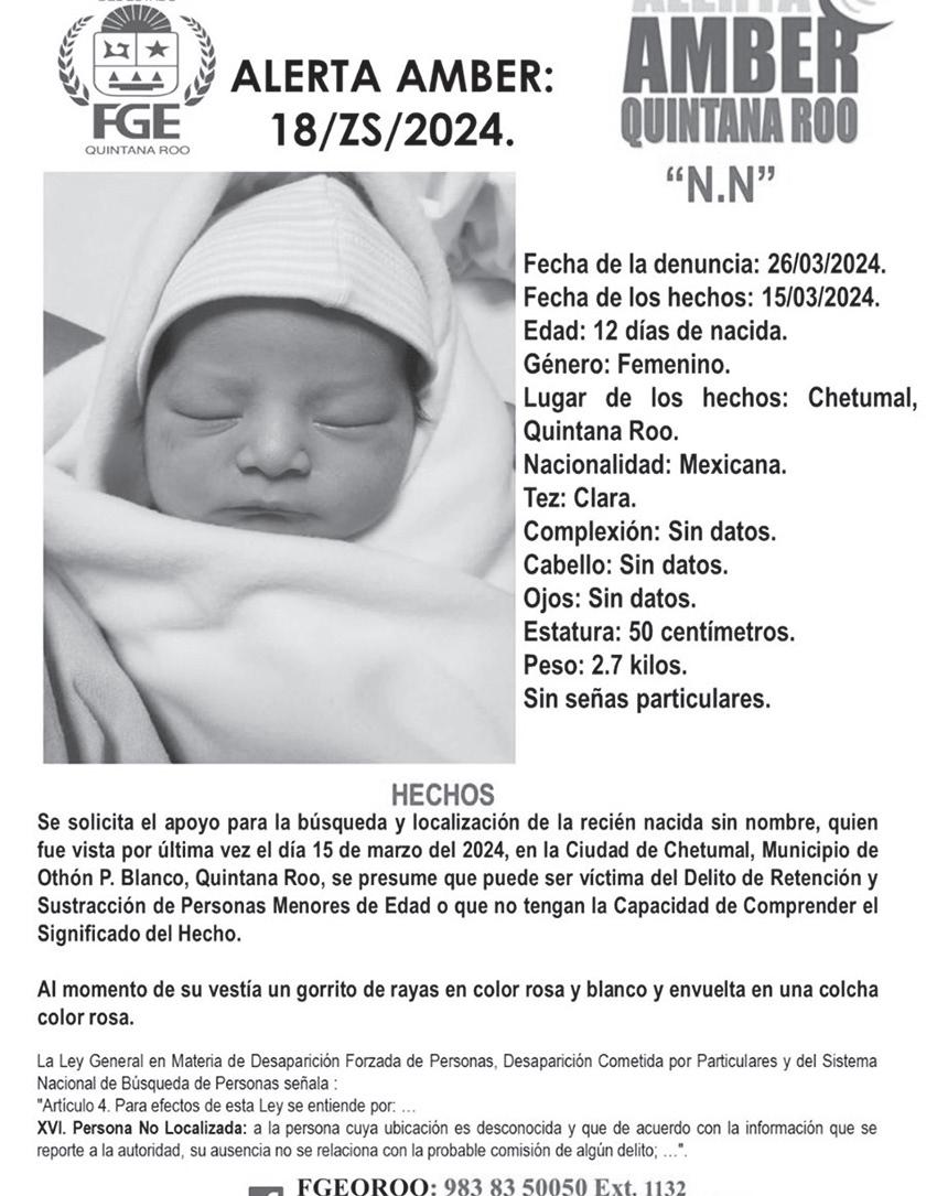 Por Agencia Infoqroo › Quequi Autoridades del estado de Quintana Roo activaron esta mañana a través del mecanismo “Alerta Amber”, la búsqueda de una recién nacida de apenas 12 días, que al parecer fue robada en la ciudad de Chetumal.