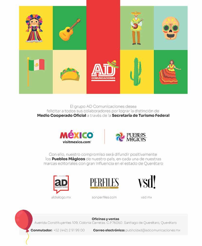 Perfiles de Querétaro, revista mensual #122, octubre de 2025. Editor responsable: Miguel Ángel Flores García. Reserva de Derechos al Uso Exclusivo Número 04-2024-100713573500-102 y Certificado de Licitud de Título y Contenido Número 17596, de los cuales AD COMUNICACIONES, S. DE R.L. DE C.V. es titular y autoriza su uso a GRUPO DONDÉ COMUNICACIÓN INTEGRAL, S. DE R.L. DE C.V. quien tiene su domicilio en Avenida Corregidora Norte, Número 62, Interior 203, Colonia Centro, C.P. 76000, Querétaro, Querétaro. Domicilio de la Publicación: Avenida Constituyentes Número 109, Interior 11, Colonia Carretas. C.P. 76050, Santiago de Querétaro, Querétaro. Imprenta: SMARTPRESS VISION S.A. DE C.V. , Caravaggio 30, colonia Mixcoac, C.P. 03910, delegación Benito Juárez , Ciudad de México. Distribuidor: AD COMUNICACIONES, S. DE R.L. DE C.V. Avenida Constituyentes Número 109, Interior 11, Colonia Carretas. C.P. 76050, Santiago de Querétaro, Querétaro. Todos los derechos reservados.