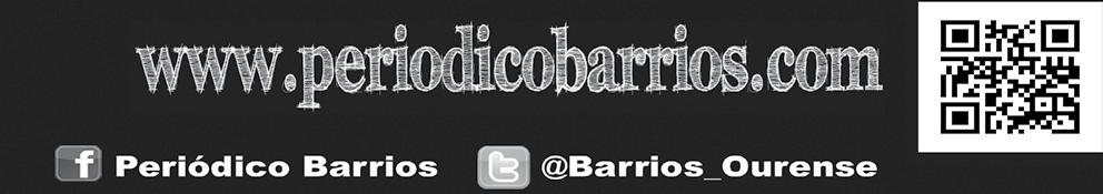 BARRIOS. Edita: Letras a la Carta S.L. CIF: B-32.323.925. Depósito Legal: OU 142-2014. Redacción: r/ Arcediagos,11, 1º - 32005 Ourense. Tel: 685 969 546. Correo-e: info@periodicobarrios.com. Distribúe: Mundopublicolor. Imprime: Publicaciones Tameiga. Director: Ramsés Torres. Director comercial: Miguel Rejo. Redacción: Miguel Rejo, Ramsés Torres. Fotografía: Ramsés Torres, Miguel Rejo. Colaboracións: Joao Damiao, Miguel A. Prieto Sotelo, Jorge E. Bóveda, C. Domarco, Avelino Jácome. Yedra Seara, Manuel Blanco