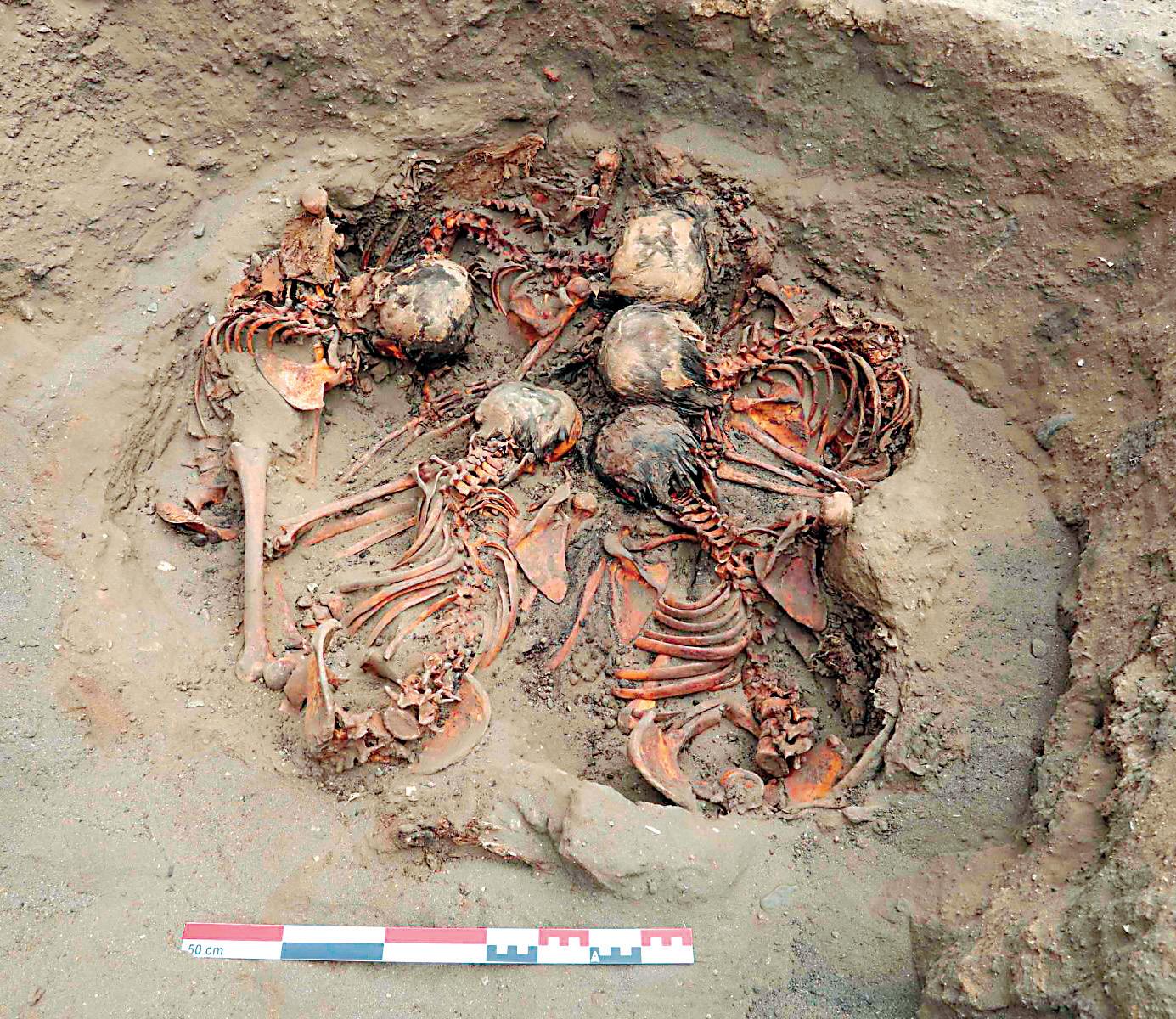 Elhallazgo se efectuó en el sitio arqueológico Pampa La Cruz, ubicado en el distrito de Huan chaco. El director del Programa Arqueológico Huanchaco (Pahuan), Gabriel Prieto Burméster, informó a la Agencia Andina de In formación que el evento sacrificial ocurrió alrededor de los años 1050 a 1100, hasta el 1200 de nuestra era, y se registró en el “montículo I”. En esa área, los arqueólogos determinaron un patrón que se repite en todas las tumbas: los cuerpos están orienta dos con los pies al este y la cabeza ha cia el oeste, dando la espalda al mar. Luis Flores, arqueólogo residente del Pahuan, detalló que en el “mon tículo II” se encontraron evidencias de más de un evento sacrificial. Sin embargo, señaló que los análisis ra diocarbónicos proporcionarán ma yor información respecto a la época en que se enterraron a dichos niños.