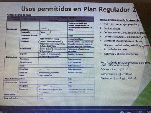 • Este proyecta contempla un cambio de destino (No hotel) a gastronomía, oficinas, Co-Working, tiendas. Sin pernoctación. Se desmantelan 2 pisos superiores para cumplir altura 7 metros PRC 2017. Contempla que Piso -6 que es el más cercano al mar tenga uso No permanente o transitorio (salas reuniones, piscina, gimnasio, spa). Habrá 4 oficinas para organismos de investigación o equivalentes, y espacio en galería de arte para artistas de la zona. Prioridad en compra de insumos y servicios para PYMES de Concón.