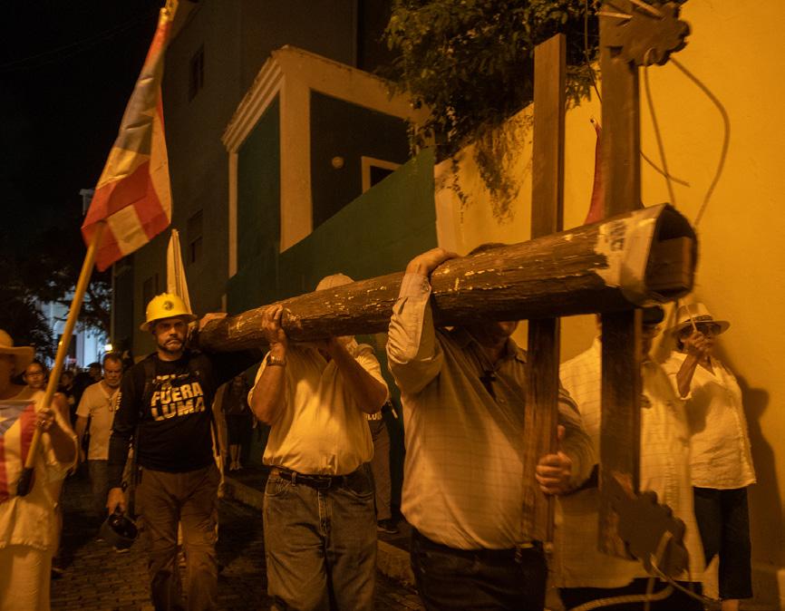 El viacrucis llegó a su octava estación en la Plaza de Colón. Allí se bajó la cruz del camión que la transportaba para conti nuar a pie el resto del recorrido. Ana María Serrano Reyes, del Capítulo de Jubilados de la Federación de Maestros, denunció la situación de los retirados. “Vemos como nuestras pensiones no alcanzan, los apago nes constantes impactan nuestra calidad de vida y los costos nos ponen en mayor pre cariedad. Hoy nosotros, las y los jubilados nos vemos obligados a buscar trabajo en Wal-Mart, saludando a la gente, o limpian do casas. Buscando la manera de sobrevi vir en gran medida para completar nuestras pensiones y cubrir los gastos por los altos costos en energía gracias a LUMA con el beneplácito del gobernador”.