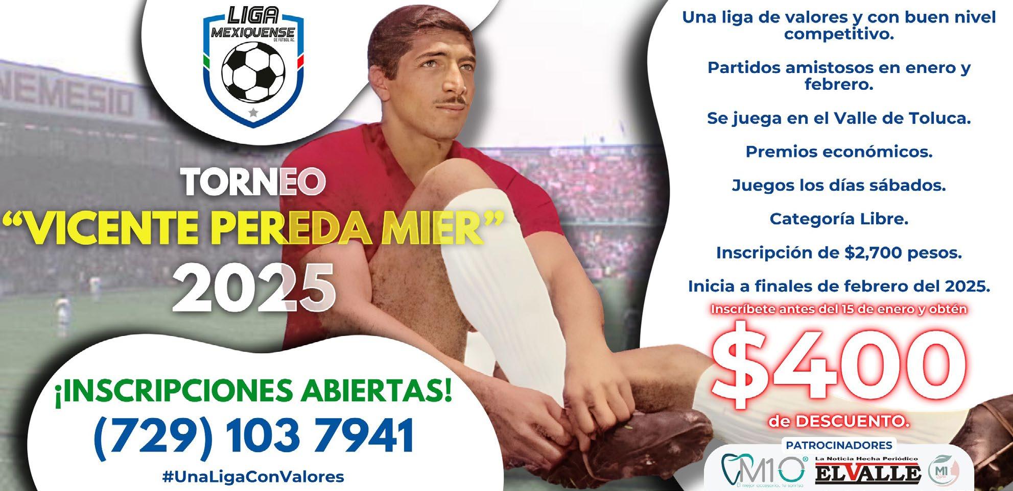 La mesa directiva de la Liga Mexiquense de Futbol, hace la invitación para que el público en general pueda ser parte de la siguiente temporada, torneo que llevará por nombre el de “Vicente Pereda Mier”, un histórico de los Diablos Rojos del Toluca, conocido como “El Diablo Mayor”, a quien se le brindará un homenaje a lo largo de varios meses.