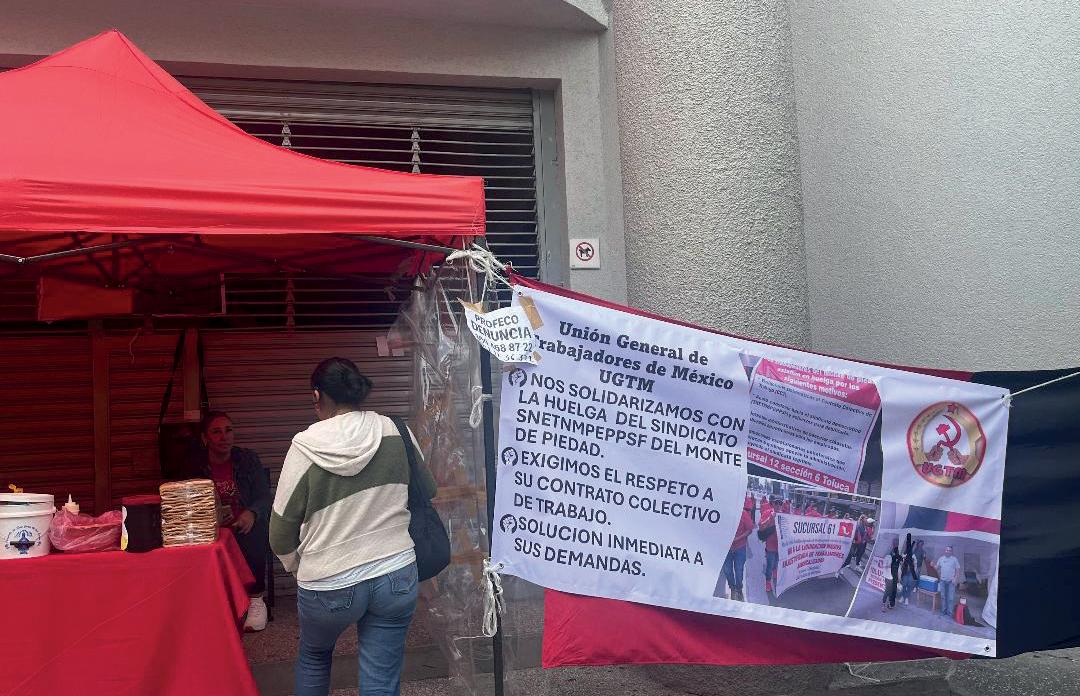 Y que la propia institución, les está señalando que hagan el pago de su desempeño por otros medios. Y que, si están inconformes, pueden acudir a PROFECO a poner su denuncia. Mientras tanto, al lugar se van turnando los y las trabajadoras y fuera de la sucursal del Monte Pío, se encuentran vendiendo algunos productos de comida; para poder contar para sus viáticos y permanecer en el lugar, “mientras se termina la huelga”, expresaron.
