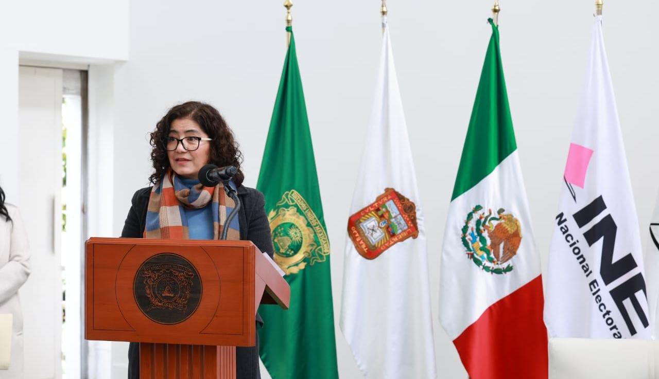 Toluca, Méx.- La rectora Martha Patricia Zarza Delgado, afirmó que la Universidad Autónoma del Estado de México (UAEMéx) mantiene su compromiso con la democracia y la participación ciudadana, especialmente entre la juventud, esto durante la Mesa de Análisis del Estudio Muestral de Participación Ciudadana (EMPC) 2024 del Instituto Nacional Electoral (INE), que tuvo como sede a la institución. En Ciudad Universitaria, Zarza Delgado destacó la importancia de la participación de las juventudes principalmente en la Reforma a la Ley Universitaria con miras a garantizar la inclusión de todos los sectores de la comunidad académica y contribuir al futuro. La rectora destacó que la presentación de la EMPC 2024 en la Máxima Casa de Estudios mexiquense reafirma el compromiso compartido con el fortalecimiento de la cultura político-electoral, con el objetivo de construir una sociedad más cercana, incluyente y equitativa.