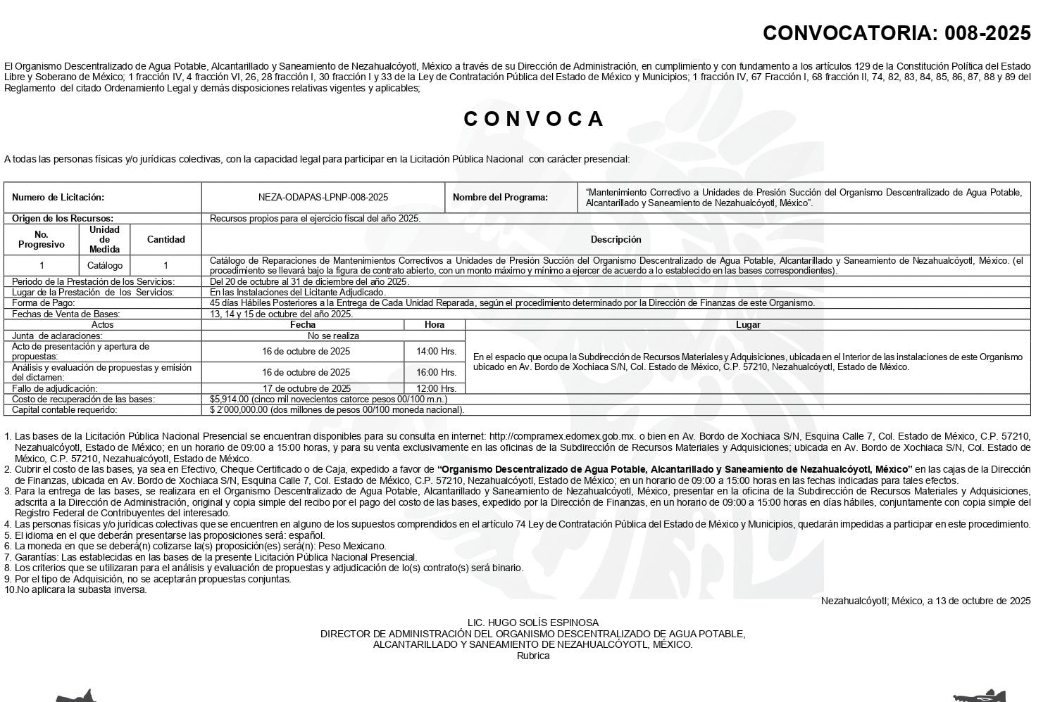 VENTA DE BASES 13, 14 Y 15 DE OCTUBRE DE 2025 9:00 A LAS 14:00 HORAS DIRECCIÓN DE RECURSOS MATERIALES, ADQUISICIONES Y SERVICIOS GENERALES, UBICADA EN EL SEGUNDO PISO DEL EDIFICIO ADMINISTRATIVO HUIXQUILUCAN, CALLE LUIS PASTEUR, SIN NÚMERO, BARRIO SAN JUAN BAUTISTA, HUIXQUILUCAN, ESTADO DE MÉXICO, C.P. 52760.