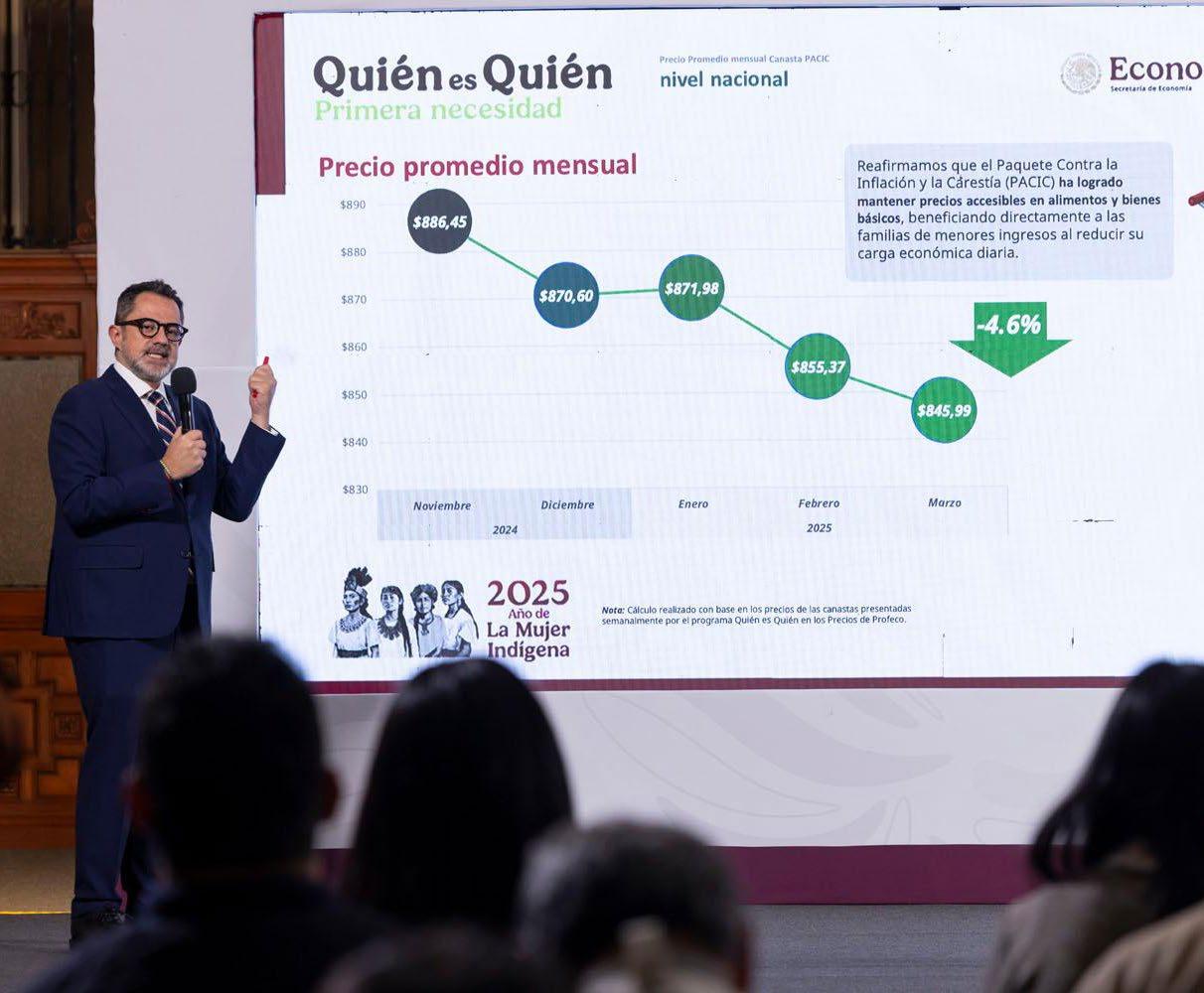 Ciudad de México.- Durante conferencia de prensa, el titular de la PROFECO, Iván Escalante destacó la disminución de precios en la canasta básica y la gasolina regular. Según el titular de la Procuraduría Federal del Consumidor, la canasta básica ha disminuido un 4.6% en precio promedio mensual, pasando de $886.45 pesos en noviembre de 2024 a $845.99 pesos en marzo de este año.