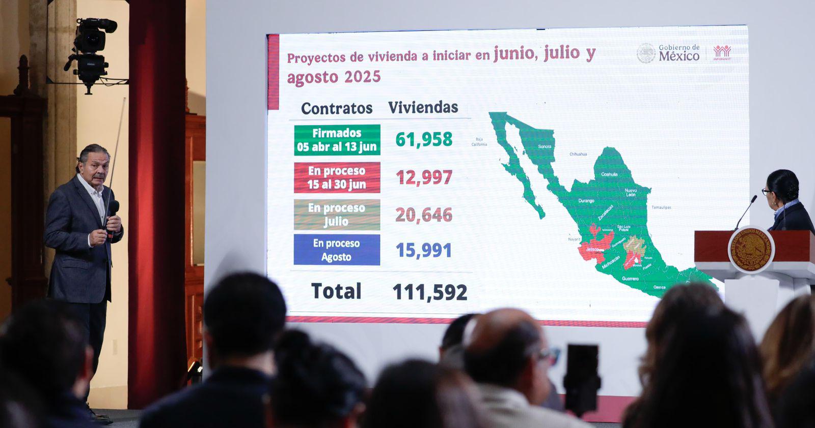 Con respecto a la construcción de viviendas para trabajadores que ganan entre uno y dos salarios mínimos, informó que ya se han firmado contratos para la edificación de 61 mil 958 casas y, para el mes de agosto, el objetivo es tener contratos firmados para 111 mil 592 viviendas. Recordó que, por instrucción de la Presidenta Claudia Sheinbaum Pardo, se congelaron los saldos y mensualidades de 4 millones 155 mil créditos impagables, de los cuales 915 mil ya recibieron una disminución de su saldo, tasa de interés y mensualidad. Mientras que, a partir de julio, 495 mil recibirán de manera automática beneficios adicionales y 1 millón 665 mil también los obtendrán, a partir del cuarto trimestre del año.