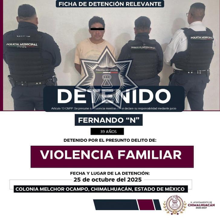 Chimalhuacán, Méx.- Tras un proceso de diálogo y contención con un probable agresor, elementos de la policía municipal lograron la detención de un generador de violencia familiar que había amenazado con lesionar a una menor de edad con un arma blanca. El aseguramiento, realizado en la colonia Melchor Ocampo, garantizó la integridad de las víctimas y la rápida actuación de las autoridades especializadas. El incidente se registró el pasado 25 de noviembre de 2025, cuando policías que realizaban patrullajes preventivos fueron alertados por una ciudadana. La víctima reportó que, al interior de su domicilio, su pareja estaba agrediéndola tanto a ella como a su familia, y lo más grave, señalaba que el individuo amenazaba con dañar a su hija con un arma blanca. Los elementos de seguridad actuaron con rapidez y cautela. Luego de establecer un proceso de mediación con el agresor, aprovecharon un momento oportuno para desarmarlo y asegurarlo, neutralizando así el riesgo inminente. El detenido fue identificado como Fernando “N”, de 36 años de edad. Durante la intervención, se brindaron atenciones inmediatas y acompañamiento a la familia afectada.