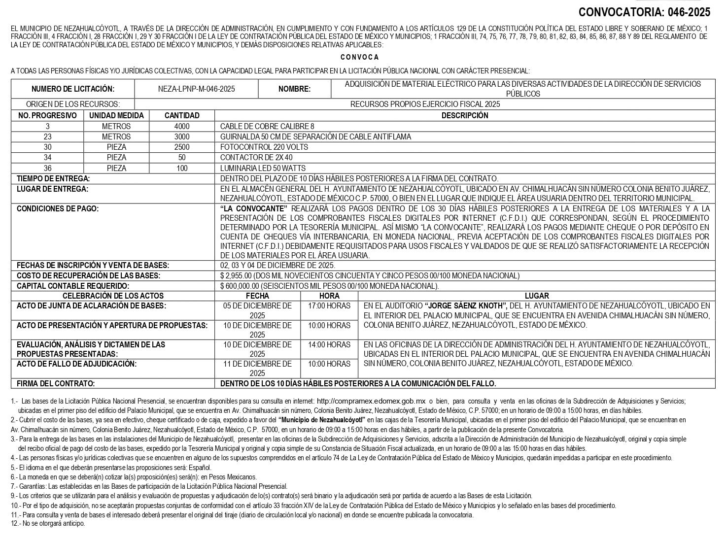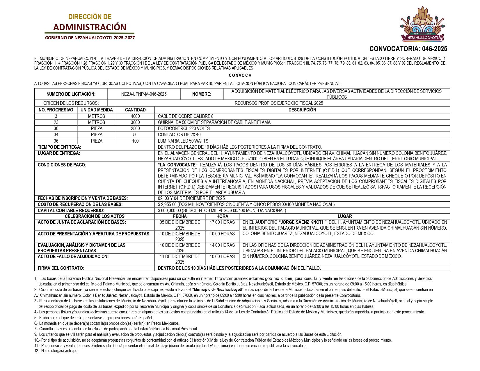 GARANTÍAS: De conformidad con los artículos 76, fracción III y 77 de la Ley de Contratación Pública del Estado de México y Municipios; 1 29 y 130, fracción III de su Reglamento, el licitante que resulte adjudicado del contrato en el presente procedimiento de Licitación Pública Nacional Presencial, deberá garantizar a favor de la Convocante, el cumplimiento del contrato. Los interesados podrán consultar las bases de la licitación previamente a su adquisición. La Convocante se abstendrá de recibir propuestas o celebrar contratos con las personas que se encuentren en los supuestos con tenidos, en el Artículo 74 de la Ley de Contratación Pública del Estado de México y Municipios. Cualquier duda o aclaración relacionada con la presente convocatoria, dirigirse a la Dirección de Recursos Materiales, Adquisiciones y Servicios Generales del H. Ayuntamiento de Huixquilucan, correo electrónico licitaciones@huixquilucan.gob.mx teléfono 5525957050 Ext: 3529. Para adquirir las bases, presentar Constancia de Situación Fiscal, impresa y actualizada, con domicilio de la persona física y/o moral interesada, y la convocatoria impresa del periódico, lo anterior para la elaboración del recibo correspondiente. A T E N T A M E N T E