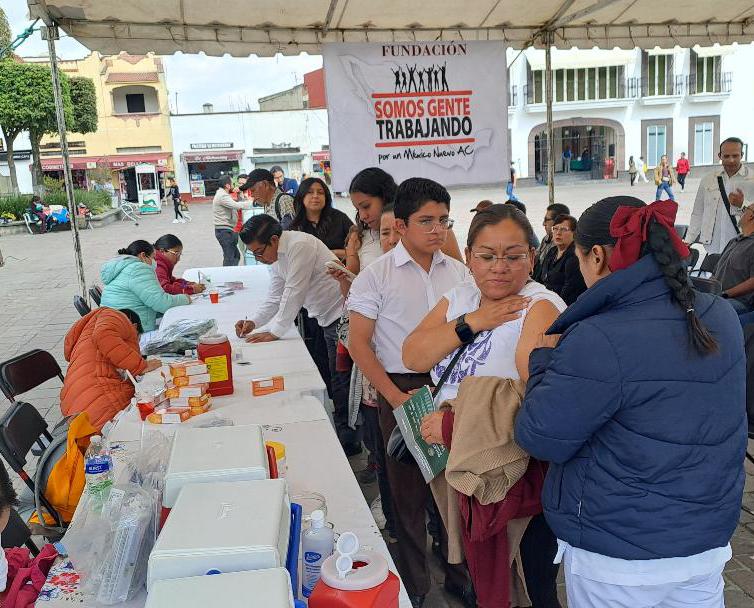 Metepec, Méx.– Este lunes, la Fundación Somos Gente Trabajando por un México Nuevo A.C., en coordinación con el ISSSTE Estado de México y el Gobierno Federal, llevó a cabo una amplia jornada de vacunación en la Plaza Juárez de Metepec, donde se dispuso de 800 dosis gratuitas para la población en general.