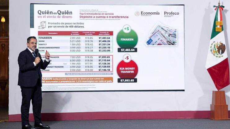 Ciudad de México.– Durante su intervención en la Mañanera del Pueblo, encabezada por la presidenta Claudia Sheinbaum Pardo, el titular de la Procuraduría Federal del Consumidor (Profeco), Iván Escalante Ruiz, informó que Finabien se mantiene como la mejor alternativa para el envío de remesas de Estados Unidos a México.