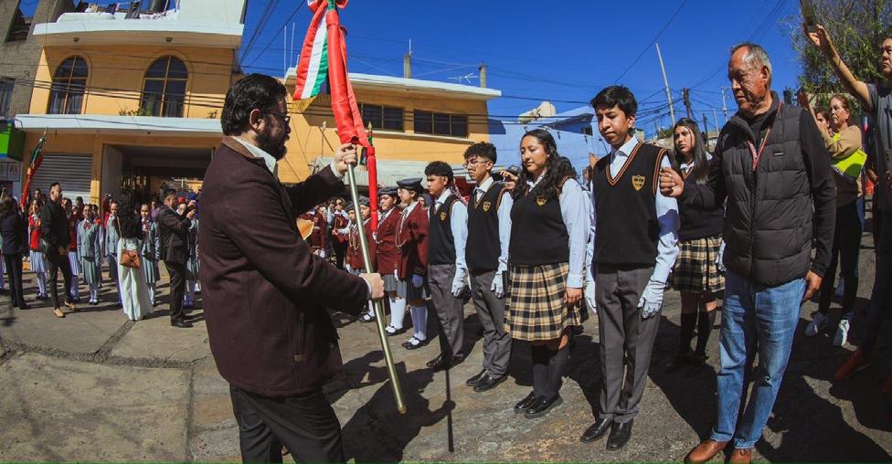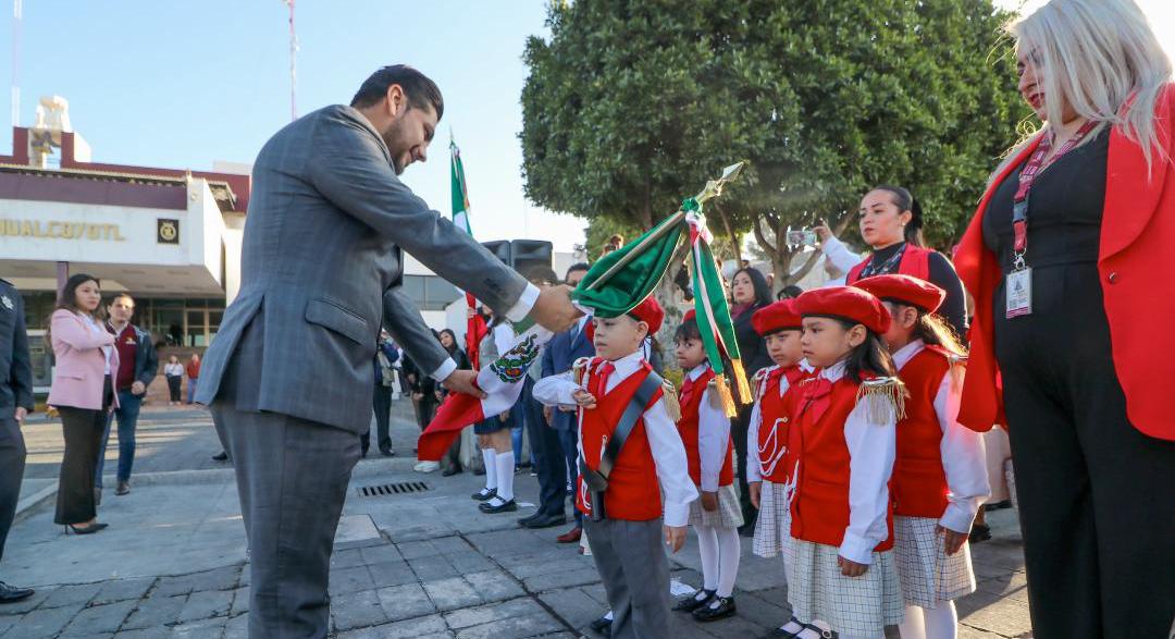 Al entregar el lábaro patrio a la escuela Leandro Valle, el alcalde pidió a todas y todos honrarla y defenderla con lealtad, justicia y constancia para construir un municipio, un estado y una nación fuertes e independientes.