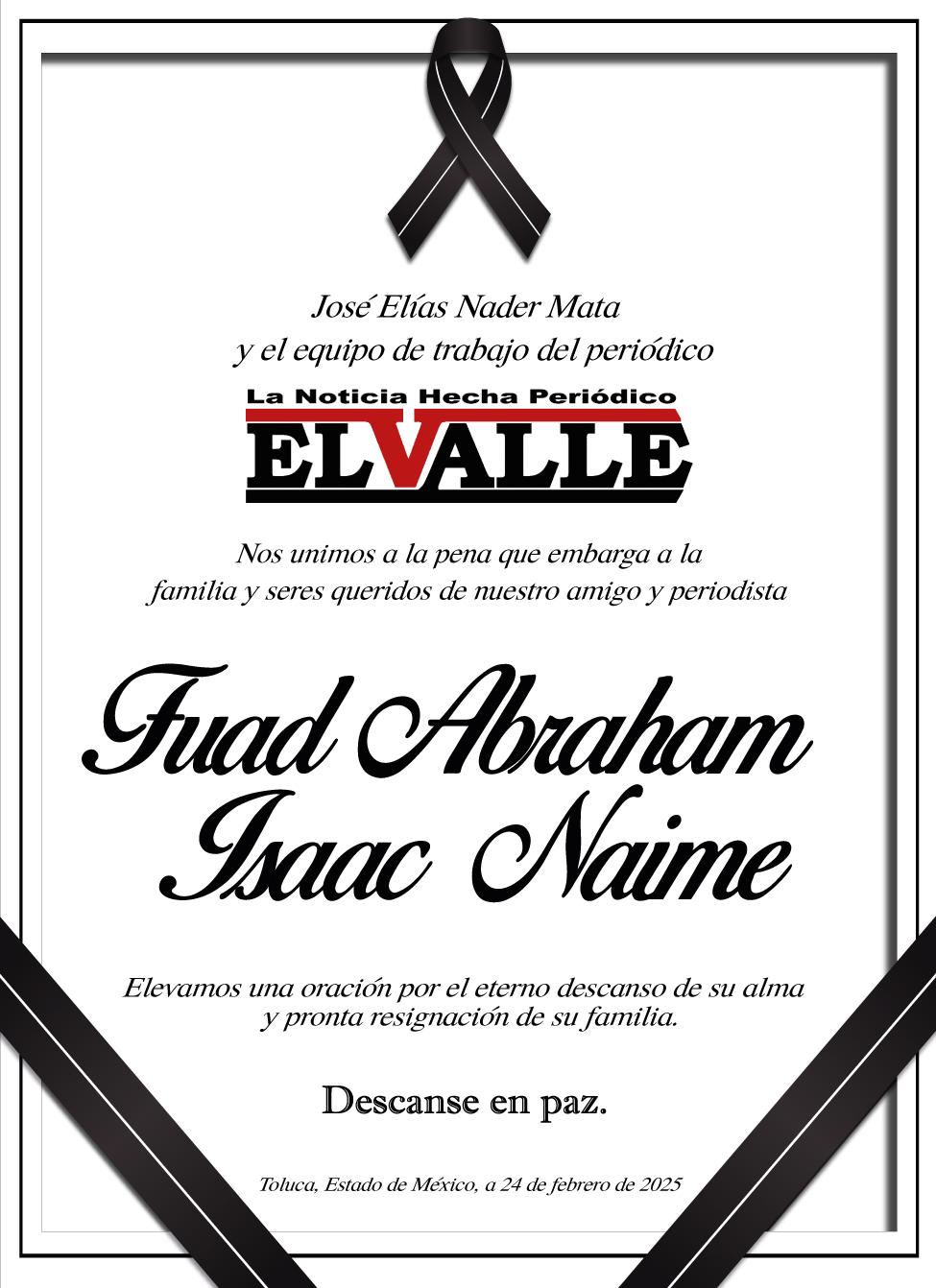 La Noticia Hecha Periódico El Valle, Año 34, 25 de febrero de 2025. Es una publicación de lunes a sábado editada por Editorial Sena, S.A. de C.V., calle Joaquín Fernández de Lizardi No. 408-A, Col. Salvador Sánchez Colín, C.P. 50150 Toluca, Estado de México, Teléfonos: (722) 219-0740 y 722219-0757, www.elvallemexico. com.mx , elvallemexico@yahoo.com.mx, Reserva de Derecho al Uso Exclusivo No. 04-2014-022810040200101, otorgado por el Instituto Nacional del Derecho de Autor, Certificado de Licitud de Título y Contenido Número 16165, Otorgado por la Comisión Calificadora de Publicaciones y Revistas Ilustradas de la Secretaría de Gobernación. Editor Responsable Sergio Antonio Nader Díaz, impreso por Editorial Sena, S.A. de C.V., calle Joaquín Fernández de Lizardi No. 408-A, Col. Salvador Sánchez Colín, C.P. 50150 Toluca, Estado de México, con un tiraje de 15,000 ejemplares y distribuido por Unión Única de Voceadores de México, A.C., calle Honduras No. 317, Col. Américas, C.P. 50140 Toluca, Estado de México.