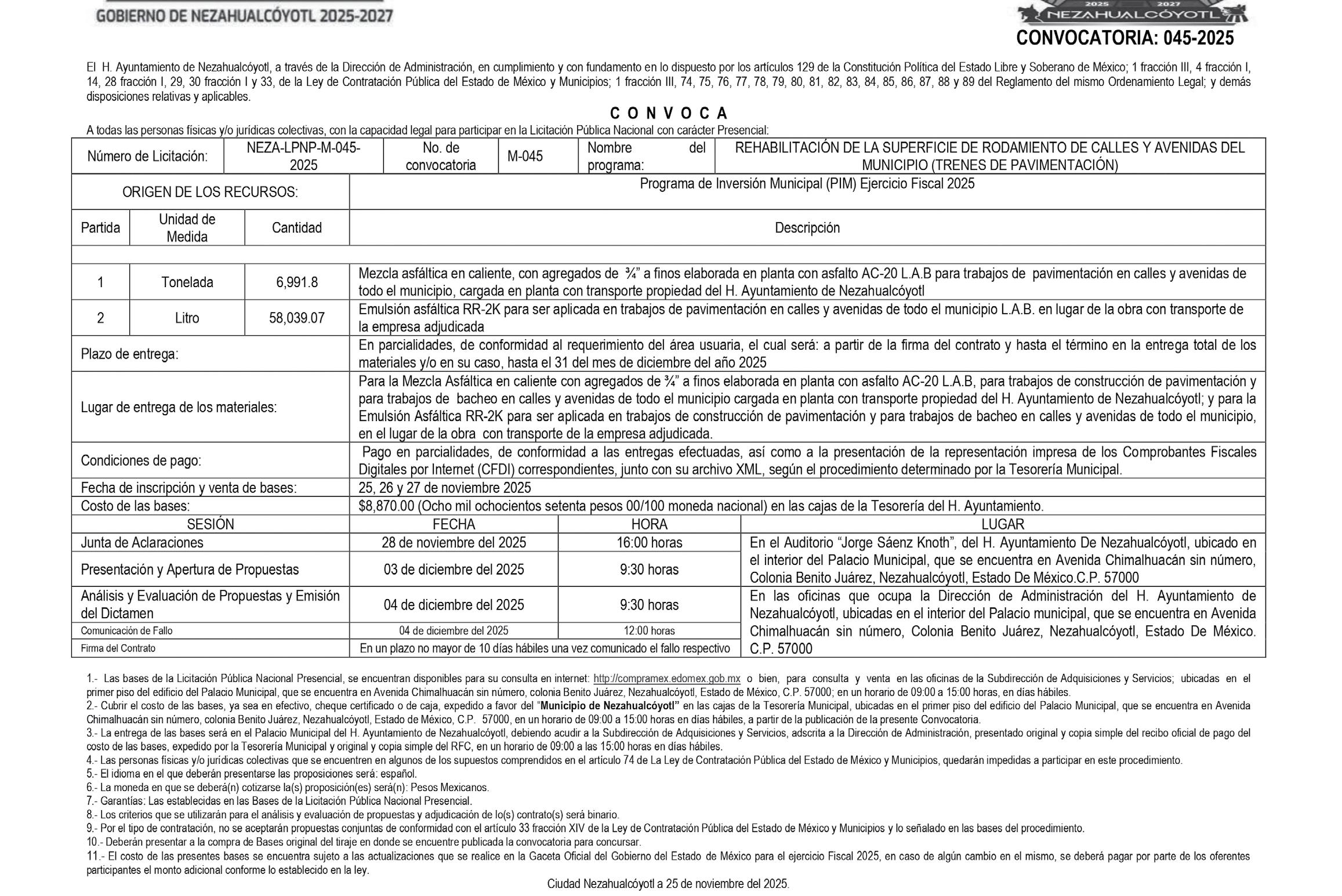 DE MÉXICO, C.P. 52760 PARA ADQUIRIR LAS BASES SE DEBERÁ PRESENTAR EL REPRESENTANTE LEGAL ACOMPAÑADO DE SU IDENTIFICACIÓN OFICIAL VIGENTE CON FOTOGRAFÍA EN CASO DE QUE SEA EXTRANJERO, DEBERÁ PRESENTAR SU FORMA MIGRATORIA VIGENTE. (ORIGINAL Y COPIA SIMPLE PARA SU COTEJO) PODER NOTARIAL GENERAL O ESPECIAL, MEDIANTE EL CUAL SU REPRESENTADA LE CONFIEREN FACULTADES PARA ADQUIRIR LAS BASES. (ORIGINAL Y COPIA SIMPLE PARA SU COTEJO) CONSTANCIA DE SITUACIÓN FISCAL ACTUALIZADA E IMPRESA, LO ANTERIOR PARA ELABORACIÓN DE LA ORDEN DE PAGO CORRESPONDIENTE. JUNTA DE ACLARACIONES 28 DE NOVIEMBRE DE 2025 14:45 HORAS SALA DE LICITACIONES DE LA DIRECCIÓN DE RECURSOS MATERIALES, ADQUISICIONES Y SERVICIOS GENERALES, UBICADA EN EL SEGUNDO PISO DEL EDIFICIO ADMINISTRATIVO