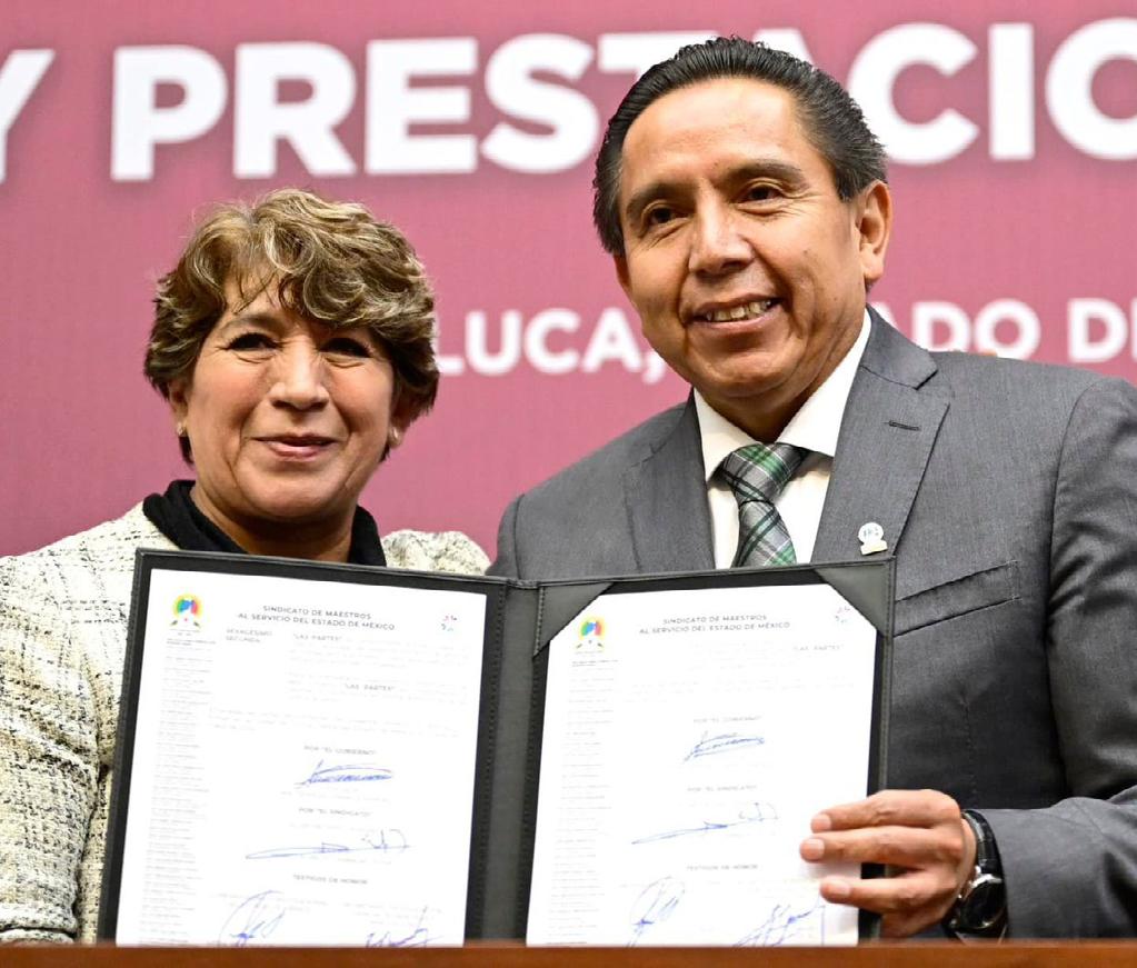 Toluca, Méx.-En un acto sin precedente en las últimas décadas y que da muestra de la cercanía de la gobernadora Delfina Gómez Álvarez con sus compañeros de profesión, la mandataria fue testigo de la firma del Convenio de Sueldos y Prestaciones 2024, signado por Marco Aurelio Carbajal Leyva, secretario general del Sindicato de Maestros al Servicio del Estado de México (SMSEM) y la oficial mayor del gobierno mexiquense, Trinidad Franco Arpero. En su discurso, la oficial mayor mencionó que este convenio, con un valor superior a 50 mil millones de pesos, busca mejorar las condiciones laborales de quienes trabajan en la