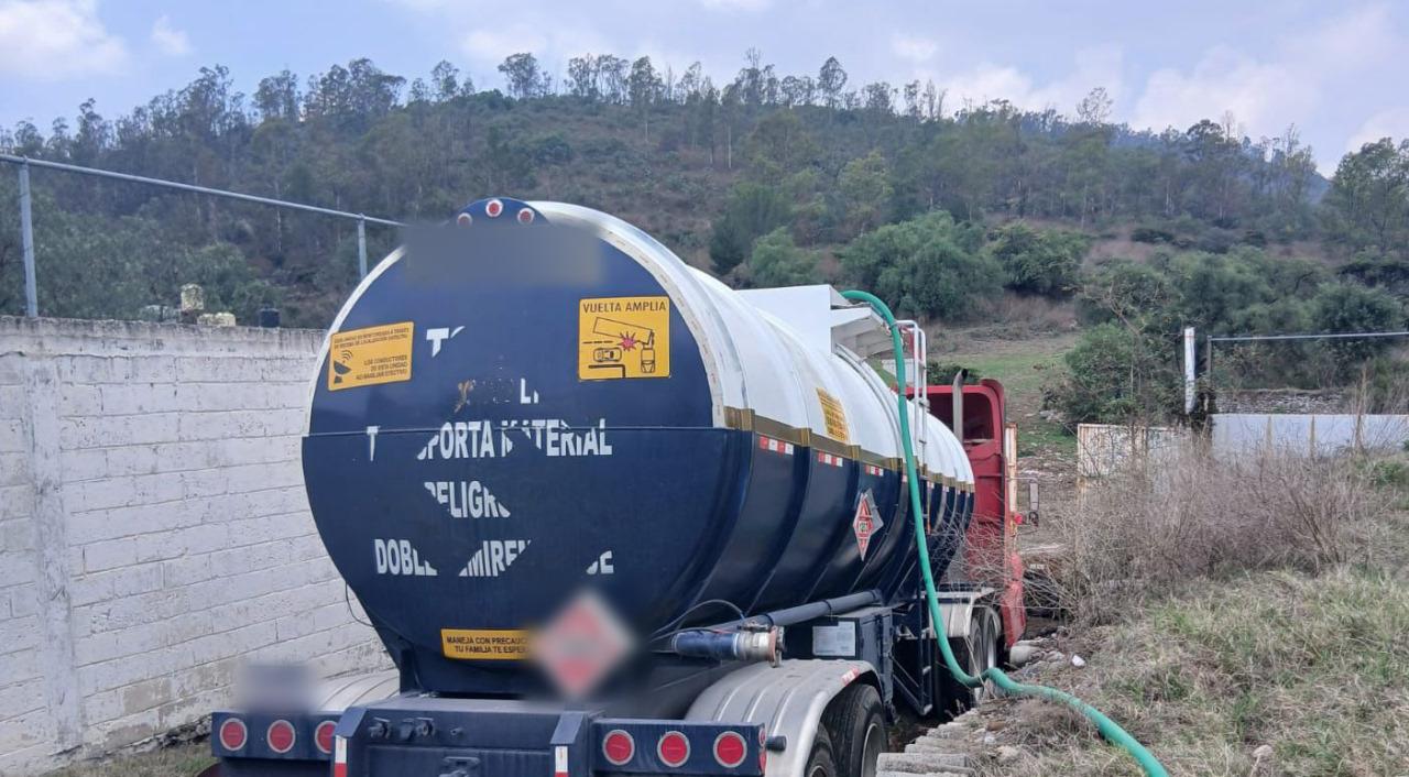 resguardaron el perímetro, al interior de la propiedad ubicaron un tractocamión marca Freightliner, color rojo, acoplado a una pipa llena en su totalidad de aparente gasolina, la cual a través de una manguera estaba conectada a una bomba de extracción y a una cisterna que en su interior contenía el recurso.
