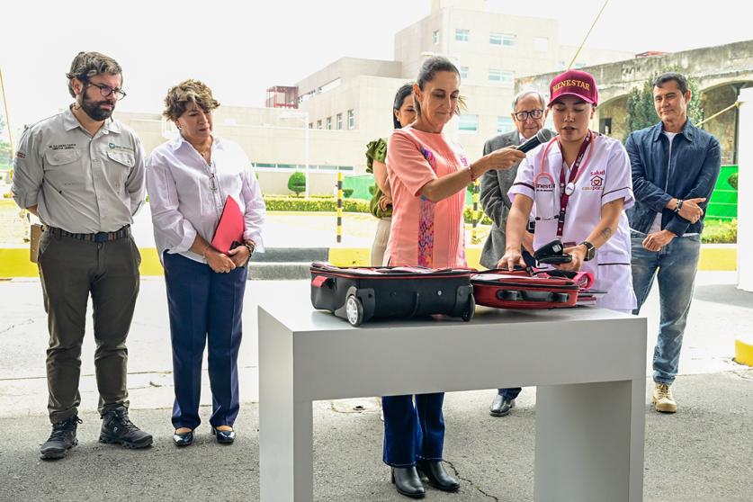 Durante este evento, las mandatarias entregaron maletines médicos con insumos sanitarios para atender a las y los pacientes, entre ellos, una tableta electrónica con la aplicación “Casa por Casa” para registrar el historial clínico, baumanómetro, termómetro, báscula, guantes
