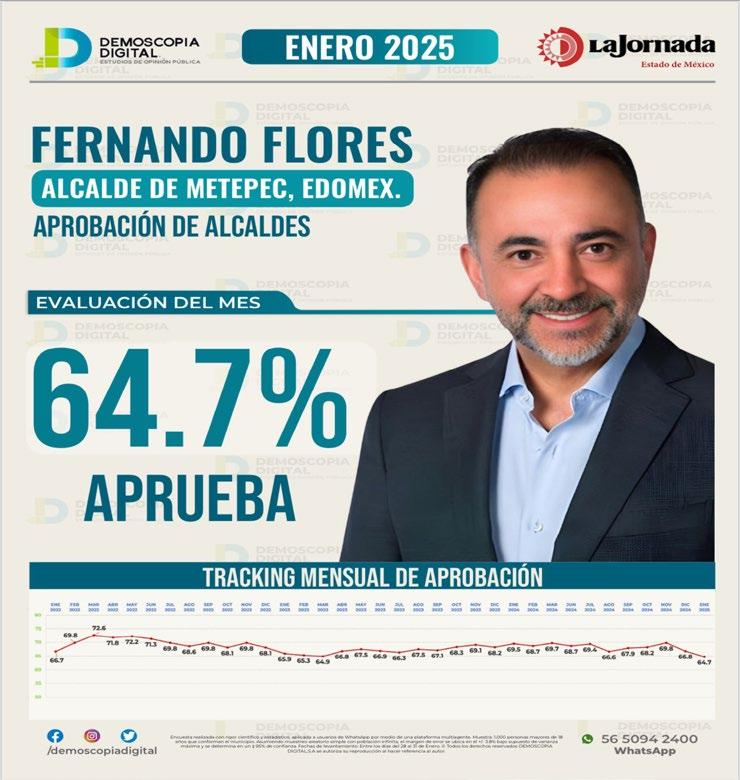 Metepec, Méx.- El alcalde de Metepec, Fernando Flores Fernández, sigue posicionándose entre los 5 mejores presidentes municipales de México, al ocupar nuevamente el 5º lugar en el ranking nacional de la encuestadora Demoscopia Digital que corresponde al mes de enero. Este reconocimiento refuerza su lugar dentro de los mejores alcaldes del país, destacando su sólida gestión, empatía y liderazgo al frente de un gobierno municipal que trabaja de la mano con su ciudadanía. El munícipe compartió a través de sus redes sociales, que mantiene una calificación aprobatoria del 64.7 por ciento, lo que refleja la confianza que sigue generando entre la ciudadanía metepequense y de otras ciudades del país.