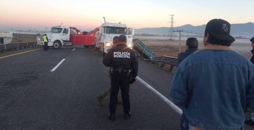 Xonacatlán, Méx.- La volcadura de un tráiler en el Libramiento Bicentenario Lerma-Valle de Bravo, provocó el cierre de la autopista a la altura del km 9+400 con dirección a Atlacomulco, antes de la caseta a Xonacatlán, mientras tanto los vehículos regresaban en sentido contrario a la vialidad.