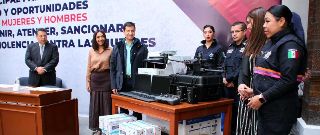 Acompañado por la Presidenta Honoraria del Sistema Municipal DIF, Paulina Arriaga, el Primer Edil realizó la entrega simbólica de equipamiento y dijo: “Cada herramienta entregada hoy, representa un paso firme, hacia una Toluca en la que ninguna mujer deba vivir con miedo o resignarse a condiciones de inseguridad”. “La suma de esfuerzos logra hacer de Toluca el espacio seguro que todos queremos”, manifestó el director general de Seguridad y Protección, Eduardo González González. Por su parte, la directora general del Instituto Municipal de la Mujer, Andrea Becerril, refirió que la actual administración cumple para que estas áreas cuenten con las herramientas y recursos necesarios que les permitan realizar su labor con mayor precisión, rapidez y eficacia para actuar en el momento oportuno.