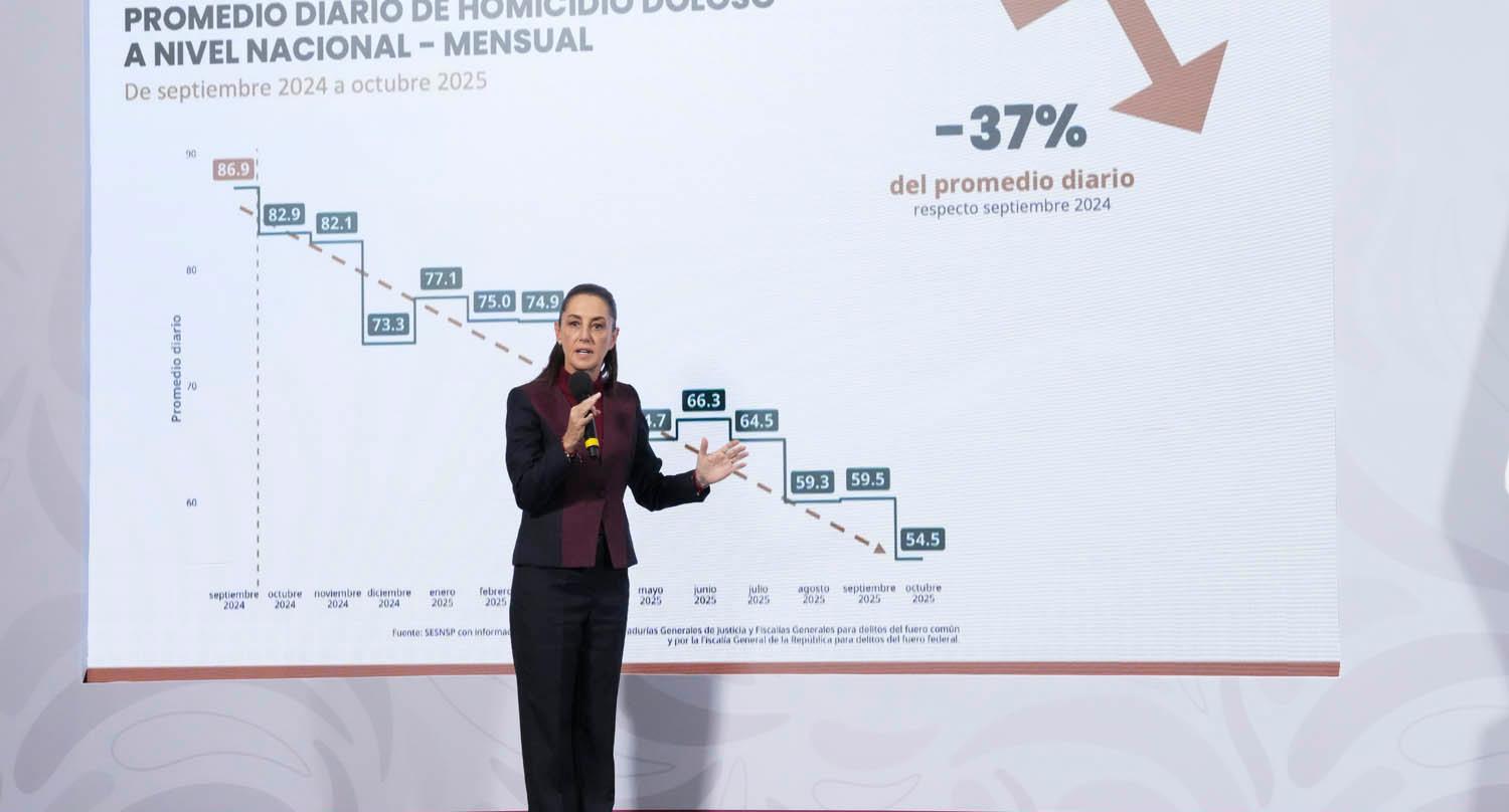 Ciudad de México.- La presidenta de México aseguró que el país registra 32 homicidios dolosos menos al día en comparación con el inicio de su administración, al destacar los resultados de su estrategia de seguridad basada en “atención a las causas” y “cero impunidad”. Durante su conferencia de prensa en Palacio Nacional, la mandataria afirmó que su gobierno “no va a traicionar al pueblo” y que continuará trabajando “en cuerpo y alma para defender y proteger a los mexicanos”. “Vamos a dar más resultados todavía, porque nosotros no vamos a traicionar a nuestro pueblo nunca. Nos comprometimos y vamos a seguir trabajando en cuerpo y alma para defender y proteger al pueblo de México”, expresó.