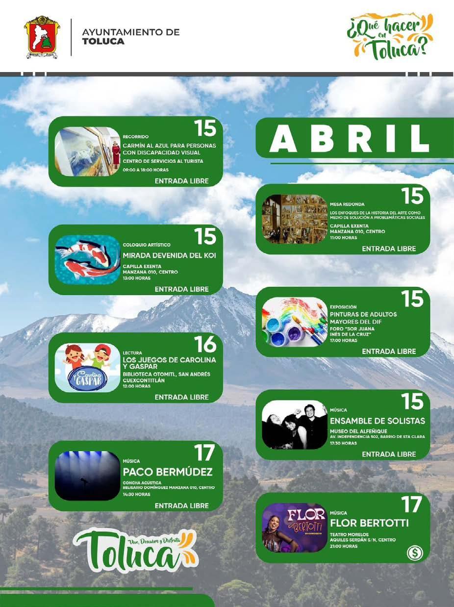 Esta semana también habrá la oportunidad de ver la belleza de las tradicionales artesanías, pues habrá una exhibición de talabartería en la Plaza artesanal Carlos Gómez. Estas actividades y muchas más son de entrada libre y para toda la familia. Por cierto, enfilándonos a la celebración del Día del Niño y de la Niña, ya empieza en “Chiquitour”. Puede consultar todos los horarios de las actividades de la Coordinación de Cultura y Turismo del Ayuntamiento de Toluca, así como la ubicación de los foros en las páginas oficiales que son Facebook: Cultura Toluca, Instagram: cultura_toluca, X: @cultura_tol.