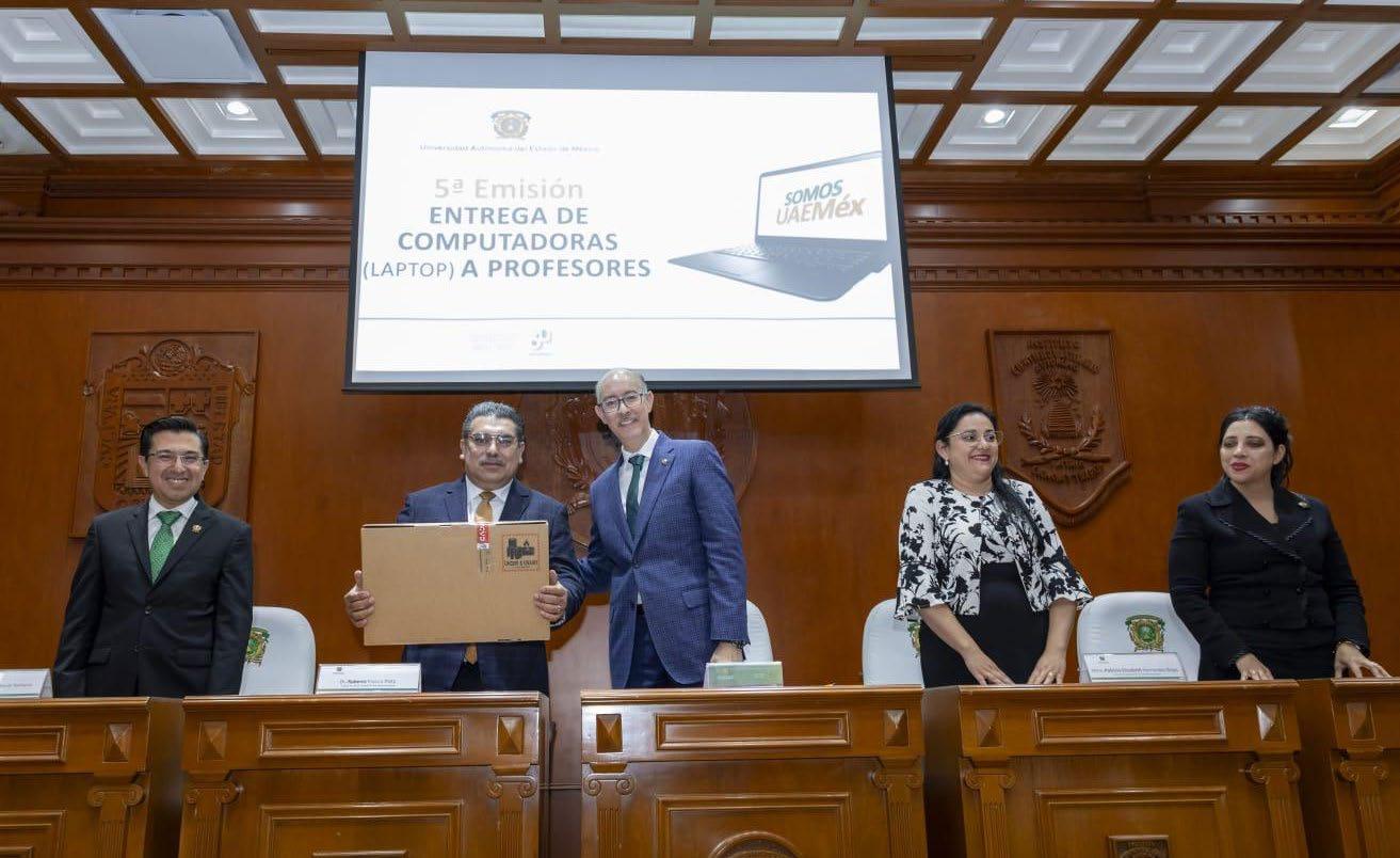 Carlos Eduardo Barrera Díaz, rector de la Universidad Autónoma del Estado de México (UAEMéx), entregó computadoras portátiles a profesores de tiempo completo, medio tiempo, técnicos académicos y de asignatura, para impulsar el uso de las nuevas herramientas tecnológicas y digitales en la práctica docente.