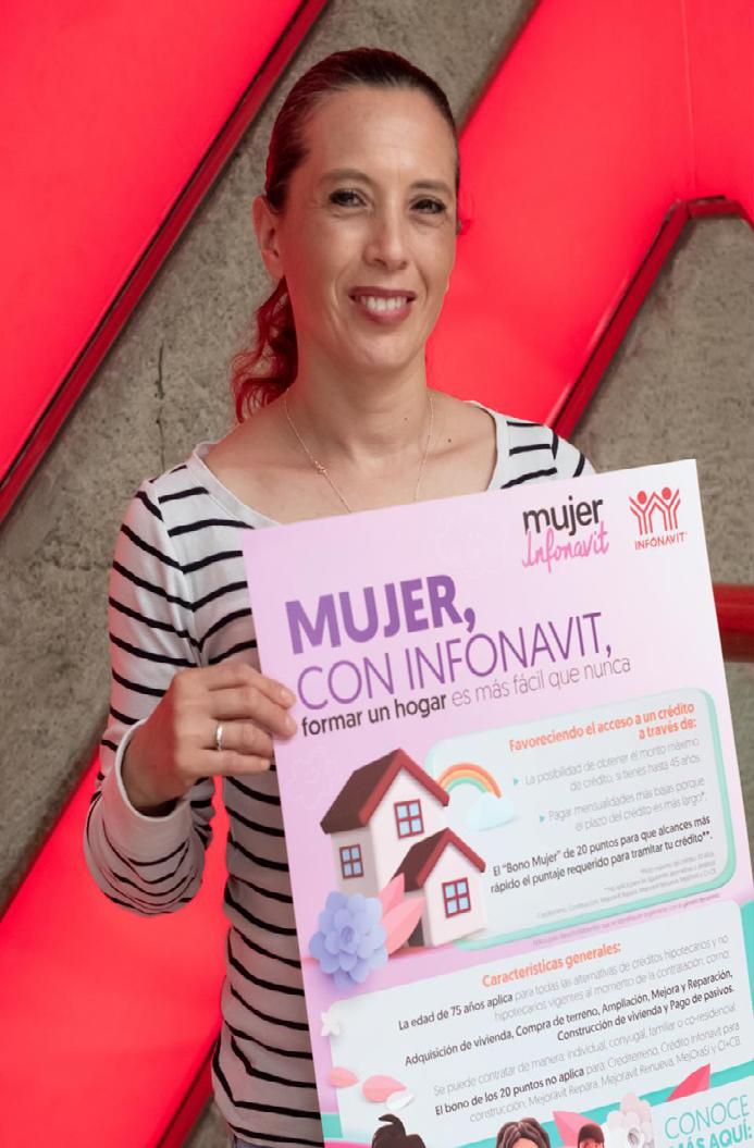 “Volverte propietaria de tu propia casa ahora es más fácil, ya que en el Instituto del Fondo Nacional de la Vivienda para los Trabajadores (INFONAVIT) te otorgamos una serie de apoyos que toman en cuenta el contexto laboral de las trabajadoras, con el objetivo de eliminar cualquier desigualdad que limite su acceso a una vivienda”,