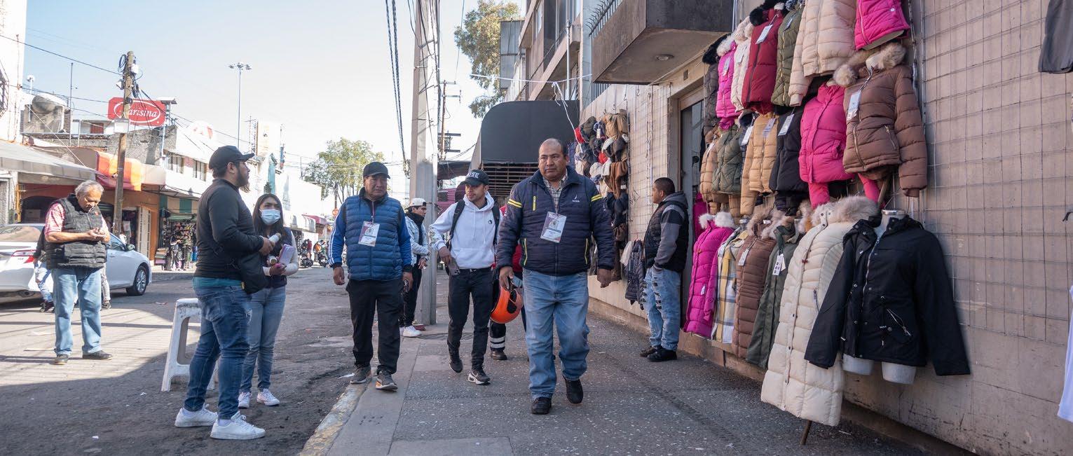 física y patrimonial de la población, mientras que 60 servidores públicos de la Dirección de Gobierno realizaron visitas a los comerciantes establecidos para verificar licencias y apoyar en su regularización. De forma complementaria, el personal de Protección Civil inspeccionó los locales para garantizar condiciones seguras y Desarrollo Económico ofreció orientación para agilizar los trámites necesarios.