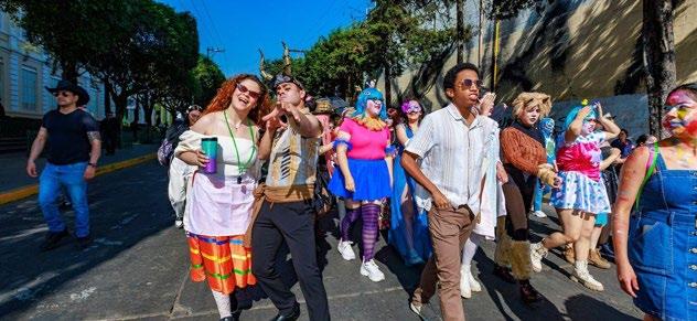 Toluca, Méx.- En medio de un ambiente festivo, estudiantes, personal artístico y administrativo de la Compañía Universitaria de Teatro de la Universidad Autónoma del Estado de México (UAEMéx), participaron en el desfile conmemorativo al Día Mundial del Teatro 2024, que inundó las principales calles del Centro Histórico de Toluca.Alumnos de las licenciaturas en Artes Teatrales de la Facultad de Humanidades; Danza, de la Escuela de Artes Escénicas y la batucada, recorrieron el centro de la capital mexiquense llenando de vida la actividad que rindió honor al Teatro.Encabezado por la secretaria de Difusión Cultural, María de la Mercedes Portilla Luja, el contingente avanzó del Edificio de Rectoría de la UAEMéx hacia el Teatro Universitario Los Jaguares, trayecto en el que arlequines y actores invitaron al público en general a acercarse a las puestas en escena que ofrece la UAEMéx. El profesor de la Licenciatura en Artes Teatrales de la Facultad de Humanidades, Israel Ríos Hernández, leyó el Manifiesto del Día Mundial del Teatro 2024, escrito por Jon Fosse, bajo el título El arte es paz, en tanto, la académica e investigadora Blanca Lilia Hernández Reyes moderó la presentación del Capítulo “Transfiguraciones Corporales en las Artes Escénicas”,