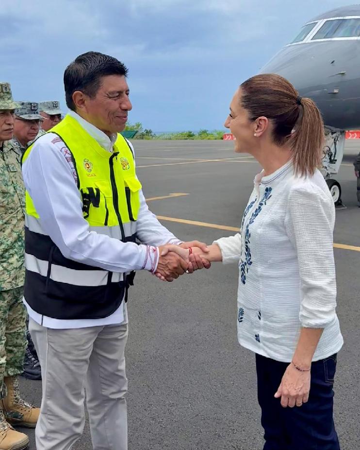 “Le damos la bienvenida a nuestra Presidenta Claudia Sheinbaum Pardo. Su compromiso y amor por el pueblo oaxaqueño se hacen presentes, una vez más, para hacer frente a las afectaciones provocadas por el huracán Erick. Vamos a trabajar incansablemente para sacar adelante a nuestras comunidades”, expresó el gobernador. De acuerdo con la Coordinación Nacional de Protección Civil (CNPC), Sheinbaum Pardo realizó un sobrevuelo por las zonas más golpeadas por el fenómeno meteorológico, acompañada por Salomón Jara y titulares de dependencias clave del Gobierno Federal, entre ellas la Secretaría de Gobernación (Segob), Secretaría de la Defensa Nacional (Sedena), Secretaría de Marina (Semar), Secretaría del Bienestar,