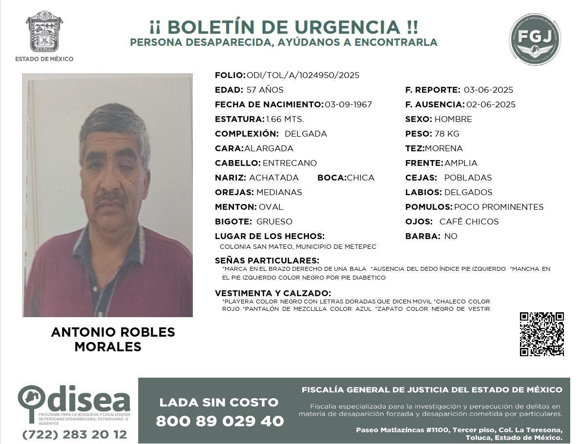 A través de una alerta Odisea se buscaba a Antonio Robles Morales, fue visto por última vez el 2 de junio en la colonia San Mateo, en el municipio de Metepec. Alrededor de las 20:50 horas del jueves,