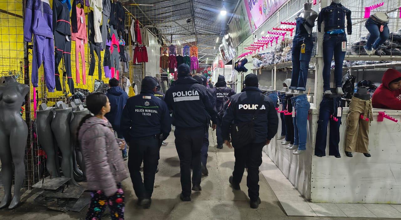 Toluca, Méx.- La Dirección General de Seguridad y Protección del municipio de Toluca desplegó un operativo en el tianguis de Palmillas para resguardar la seguridad de los compradores y vendedores así como para garantizar la movilidad adecuada a través de la recuperación de pasillos y corredores