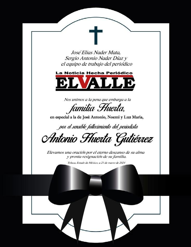 Hoy el periodismo mexiquense está de luto, se nos adelanta en el camino nuestro buen amigo TOÑO HUERTA, sin embargo, continuará presente en nuestros corazones y memoria, por ello es que elevamos una oración al cielo y nos unimos a la pena que embarga a su familia, en especial a ANTONIO, a NOEMI y a LUZ MARÍA, a quienes les manifestamos nuestro más sentido pésame, pero también el mensaje de que don TOÑO HUERTA siempre será recordado como un gran ser humano y periodista, un amigo al que siempre llevaremos en el corazón.