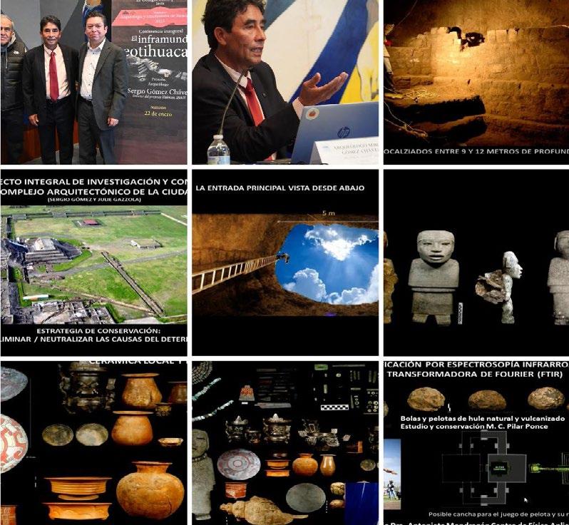 El líder del proyecto estuvo acompañado del presidente de El Colegio Mexiquense, Raymundo César Martínez García, quien coordina el seminario desde sus inicios hace 18 años, y del investigador Xavier Noguez Ramírez, quien moderó la conferencia.Gómez Chávez dio una idea completa de lo hallado en el túnel de 103 metros de largo que atraviesa la ciudadela y de las cámaras a las que lleva, de donde se han extraído 300 mil objetos, muchos de pirita, pizarra y jade; un millón de semillas, en las que se trabaja para hacerlas germinar 1 700 años después de que fueron depositadas en ese sitio, pelotas de hule, huesos humanos de sacrificios rituales y de animales, así