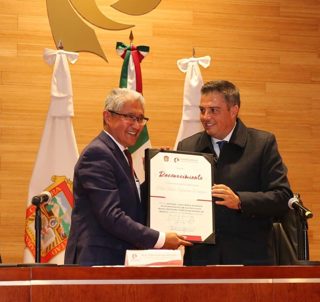laborales del PJEdomex son los únicos en el país con certificación ISO 27001 en seguridad de la información, lo que garantiza transparencia y protección de datos en el manejo de expedientes electrónicos, posicionando a la entidad como líder en el uso de herramientas tecnológicas para la justicia. En este marco, se entregó un reconocimiento al Consejero Espinosa Márquez, por su entrega, capacidad y probidad en el desempeño de sus funciones dentro del Poder Judicial del Estado de México, al frente de la Materia Laboral.