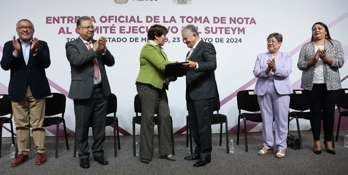 oluca, Méx.- En el Salón del Pueblo del Palacio de Gobierno, la gobernadora Delfina Gómez Álvarez realizó la entrega de la Toma de Nota al Comité Ejecutivo del Sindicato Único de Trabajadores de los Poderes, Municipios e Instituciones Descentralizadas del Estado de México (SUTEYM), donde reconoció a cada uno de quienes integran este sindicato de gran vocación institucional, por su contribución al Estado de México, mediante el servicio público humano y de calidad. En el evento, la gobernadora resaltó el gusto de recibir a cada uno de los Suteymistas, quienes dijo, con gran vocación institucional a diario trabajan en las labores más importantes de la administración pública, y que por ello se convierten en el motor del Gobierno y de las diferentes instituciones.