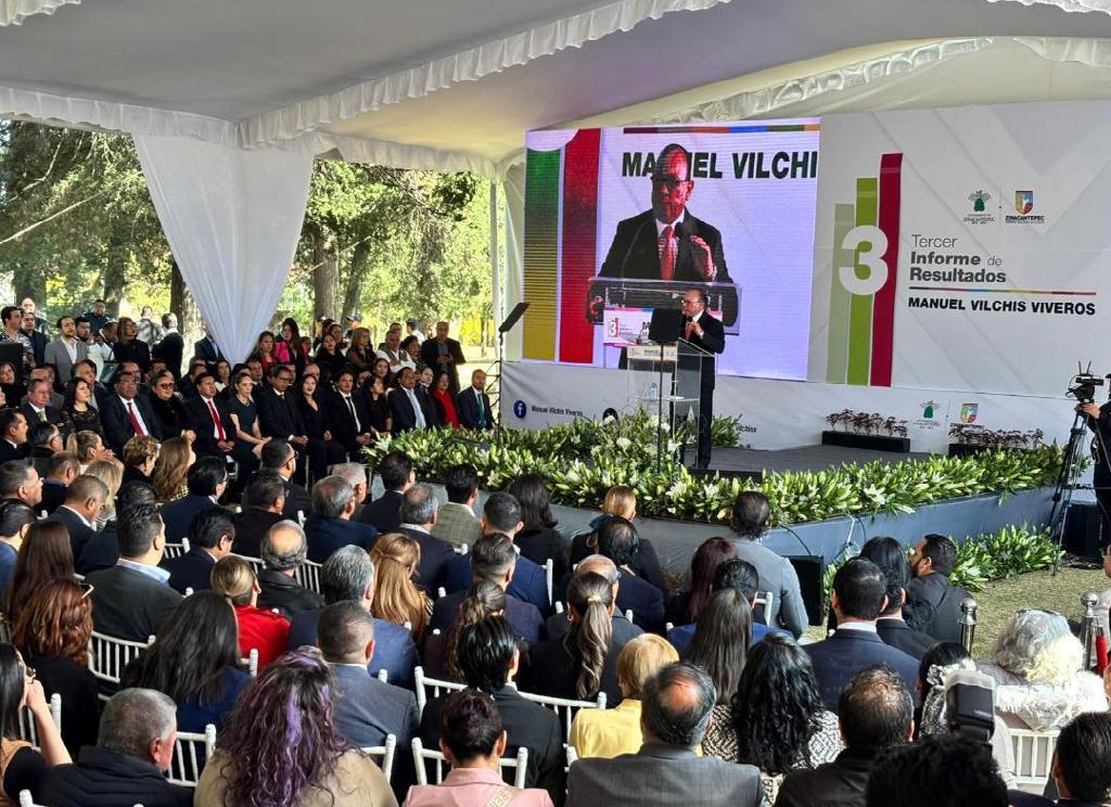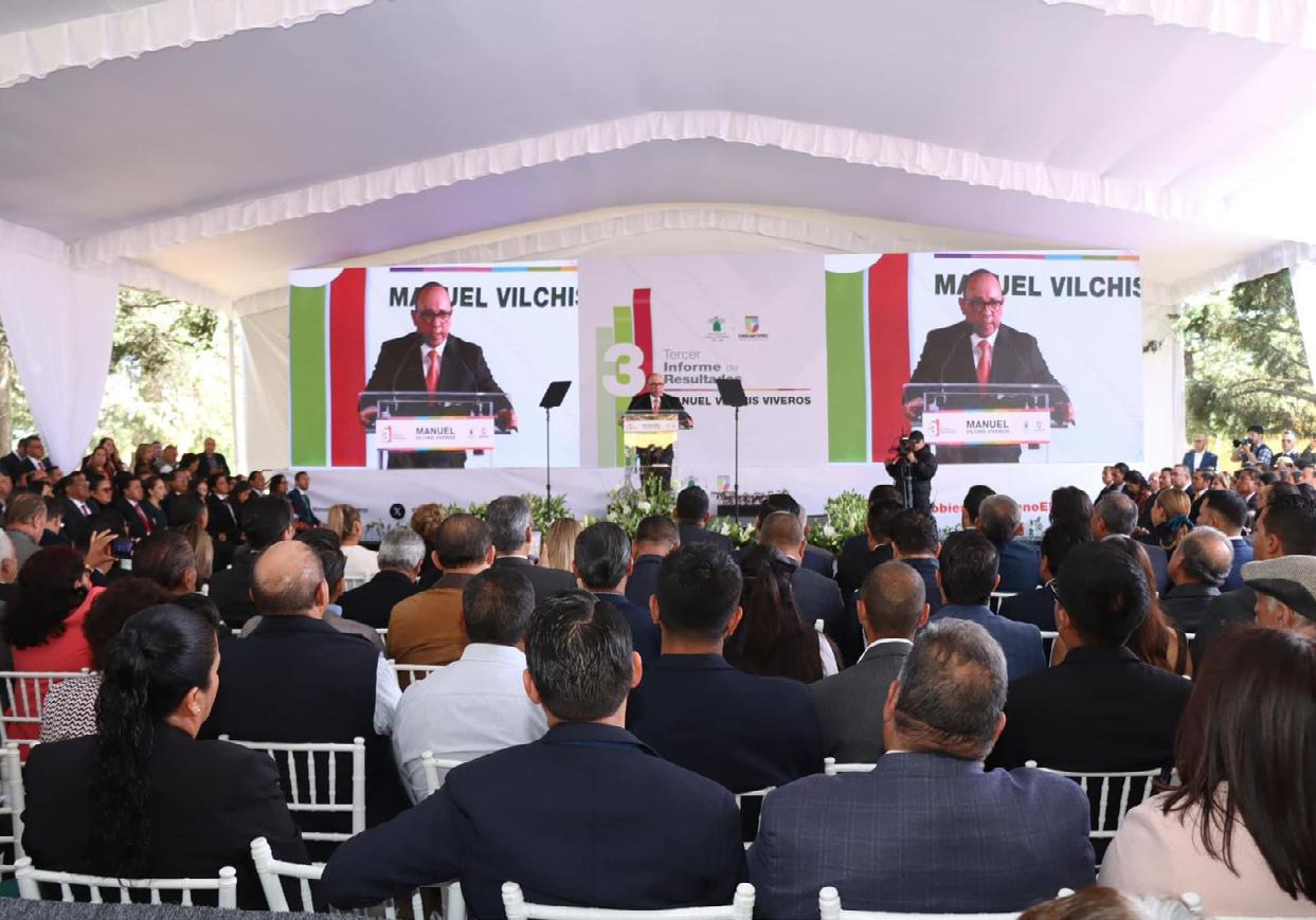 Es del Tercer Informe de Resultados del presidente municipal de Zinacantepec, MANUEL VILCHIS VIVEROS, que, arropado por la gente del municipio, el cabildo, legisladores y funcionarios estatales, brindó cuentas de lo que ha sido su trabajo a lo largo de este año en el que destacó la estabilidad financiera del municipio, lo anterior, después de que en gobiernos anteriores prácticamente estuvieran en quiebra.