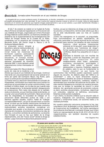 hechos, ya que se relaciona a la droga con la diversión de los jóvenes y al descontrol, término este último que día a día se está naturalizando cada vez más en nuestra sociedad. ¿Cómo nos manejamos en la escuela?, se preguntaba. Pues convirtiéndonos en adultos significativos, de referencia, para dotar a nuestros alumnos de los recursos pertinentes para resolver los desafíos de este momento histórico. ¿Qué acciones implementar entonces en la escuela?, pues desarrollar en los alumnos una “conciencia de riesgo”, formar sujetos autónomos en la resolución de conflictos, desde muy pequeños en el aquí y ahora. Explicaba la docente que son muchas las preguntas y pocas las respuestas, pero que éstas deben producirse en cada establecimiento entre todos: profesores, auxiliares, preceptores, autoridades y padres. Debe existir el “puente” entre adolescentes y mayores. Posibilitar espacios de palabra, para lo que es fundamental la “buena escucha”, ya que hasta los sentimientos más horribles pueden soportarse cuando alguien los escucha. Se debería pasar del “déficit a la posibilidad” y esto se logra ofreciendo lugares, oportunidades y desafíos de construir fortalezas propias, mediante espacios de producción, confianza, respeto y aprendizajes que necesitan del potencial de los pibes. De esta manera trabajamos la inclusión de nuestros jóvenes, cosa que no tengan la necesidad de recurrir a otros ámbitos. Así, generando acciones de promoción cultural, es decir, acciones educacionales, recreativas, deportivas y/o culturales, estamos en definitiva, previniendo. Estamos construyendo ciudadanía. Y por último, la docente enfatizó que la solución está en nosotros, trabajando con conciencia, responsabilidad colectiva y compromiso social, con acciones reales y no dudosas promesas. Por nuestra institución estuvieron presentes la Ing. Agr. Julia Bianco (Prof. de Biología) y el Ing. Edgardo Pina (Prof. de Construcción de Ciudadanía). Así mismo participaron los profesores Ana Pascual y Leonardo Ortega, que si bien fueron en representación de las E.S.B. N°2 y E.S.B. N°12 respectivamente, son también docentes de nuestro establecimiento.