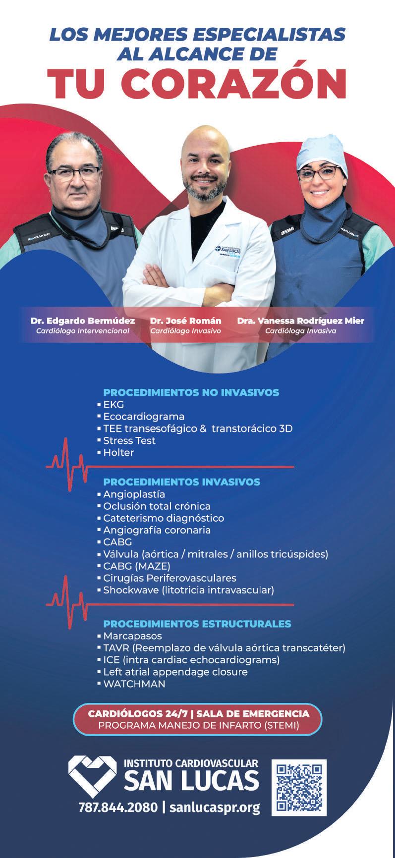 es una solución universal y que cada caso debe evaluarse de manera individual. La decisión de realizar el procedimiento surge de una evaluación cuidadosa por un equipo multidisciplinario, conocido como “Heart Team”, integrado por cardiólogos y cirujanos cardiovasculares. “No todos los pacientes se benefician de la misma alternativa”, explicó el doctor. “Nuestro compromiso es identificar cuál tratamiento ofrece mayor seguridad y mejores resultados para cada persona”. Finalmente, el especialista hizo un llamado a no ignorar los síntomas. “Cuando la estenosis aórtica empieza a dar señales, el riesgo de muerte aumenta significativamente si no se trata”, advirtió. “Evaluarse a tiempo puede salvar la vida y devolver calidad de vida de forma sorprendente”. Para información sobre el Centro Médico Episcopal San Lucas y los servicios que ofrece, accede a sanlucaspr.org, llama al 787-844-2080 o síguelos en sus páginas de Facebook, Instagram, LinkedIn y YouTube.