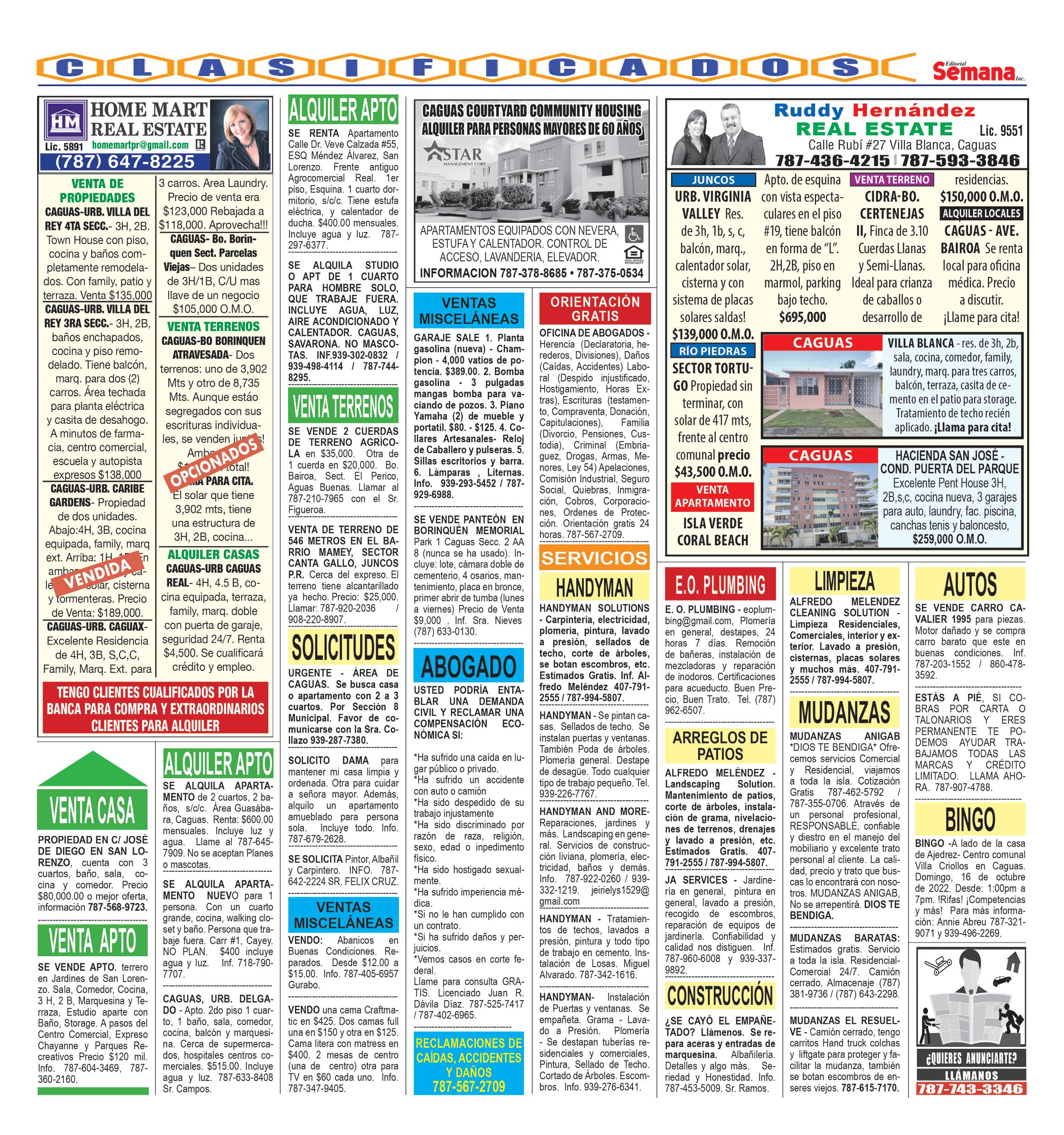 artes de anuncios confeccionados por esta publicación no podrán ser reproducidos por el anunciante bajo ninguna circunstancia, sin previa autorización de la empresa. Los artículos firmados son de la completa responsabilidad de sus autores, y no reflejan, necesariamente, la opinión de EDITORIAL SEMANA, INC. Nos reservamos el derecho a editar toda información antes de ser publicada. La empresa editora no se compromete a devolver originales de fotos u otro material sometido para su posible publicación. Autos...........................31 Clasificados..................32 Deportes..................34-35 Directorio Legal............20 Medicina..................24-28 Obituarios................33 CUBRIENDO LOS PUEBLOS DE: Caguas • Humacao Gurabo • Juncos Las Piedras San Lorenzo • Naguabo Yabucoa • Cayey • Cidra Aguas Buenas EDITORIAL SEMANA, INC. PUBLICADO SEMANALMENTE POR Editorial Semana, Inc. PO Box 6537 Caguas, PR. 00726 E-Mail noticias: redaccion@periodicolasemana.net E-Mail general: lasemanaelpionero@gmail.com www.periodicolasemana.net Editorial Semana DIRECTORA DE VENTAS: Lisette Martínez DIRECTOR EDITORIAL: José Javier Aponte Parsi DIRECTOR DE PRODUCCION: Manuel Sierra Burgos DIRECTOR DE PRODUCCION: Manuel Ortiz Pedraza DIRECTORA CUENTAS POR PAGAR: María de L. Márquez Telefonos 787.743.3346 787.743.6637 • 787.743.5606 •Agencias de Publicidad 787.744.7910 Brigadas contratadas por alcalde de Caguas siguen trabajando para adelantar energización Brigadas llevan a cabo trabajos de desganche y limpieza en el Barrio Cañabón con el objetivo de que LUMA Energy avance en el restablecimiento del servicio eléctrico.