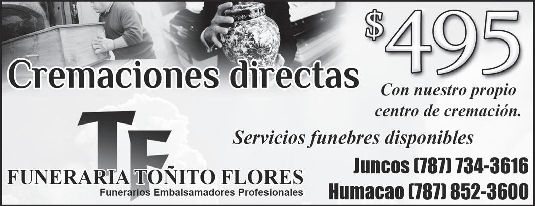 Jonatan Ramos Director Funerario Aceptamos la Mayoría de los Planes Funerales Pre-Arreglos sin Interes •Cómodas Facilidades •Amplio Estacionamiento Tels. 787.258.2664 •939.639.2533 Bairoa la 25, Caguas (antiguo JF Montalvo)