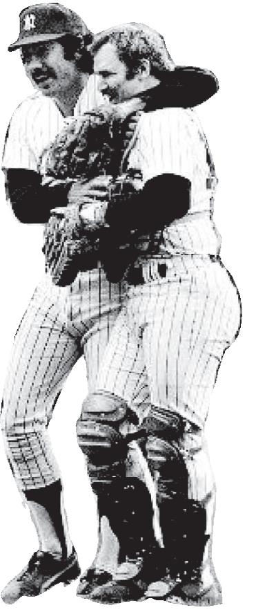 Eduardo Figueroa celebra con el receptor Thurman Munson luego de ganar su juego 20.