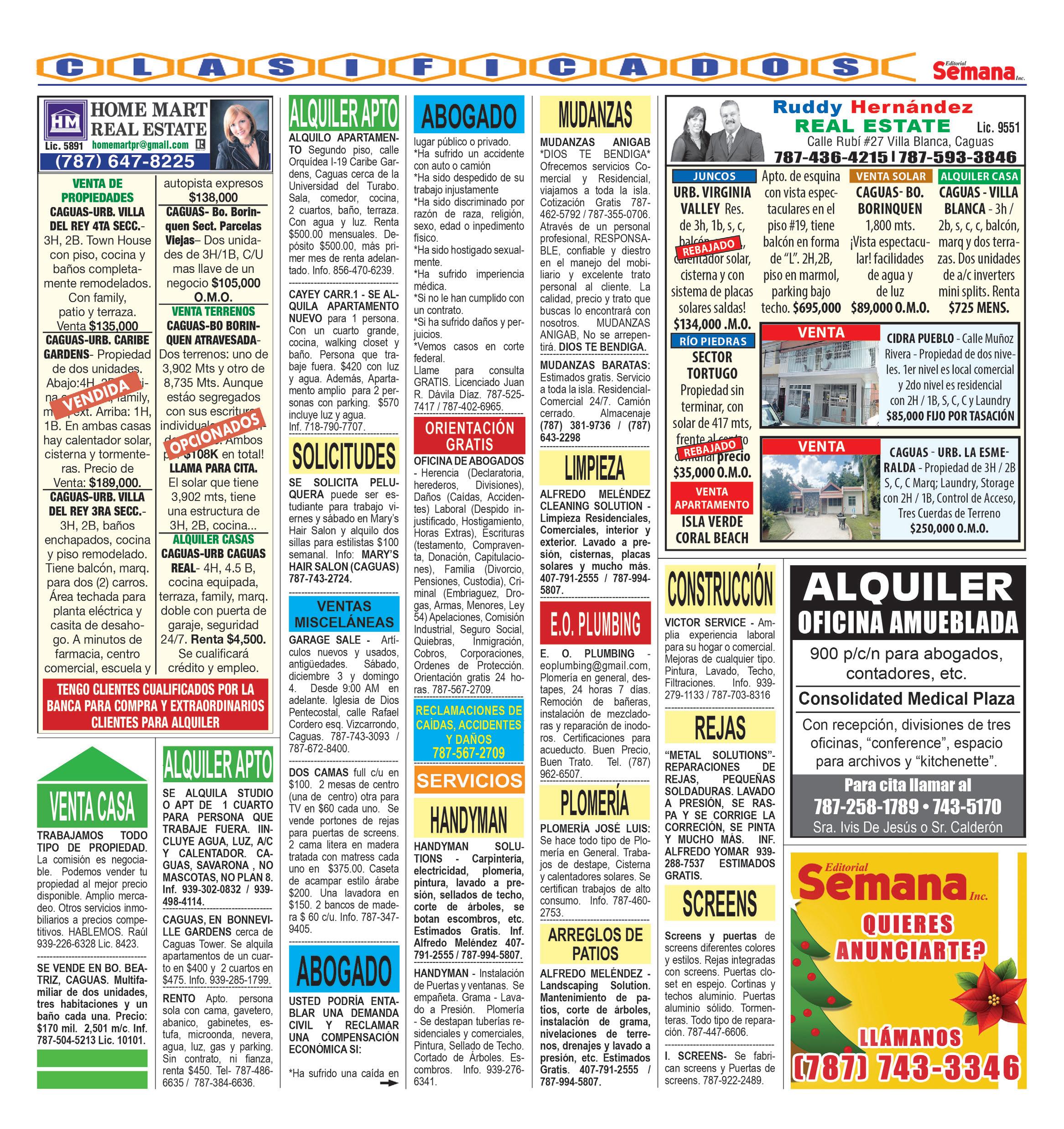 Autos...........................25 Clasificados..................26 Deportes..................28-31 Directorio Legal............16 Medicina..................20-22 Obituarios................27-28 CUBRIENDO LOS PUEBLOS DE: Caguas • Humacao Gurabo • Juncos Las Piedras San Lorenzo • Naguabo Yabucoa • Cayey • Cidra Aguas Buenas EDITORIAL SEMANA, INC. PUBLICADO SEMANALMENTE POR Editorial Semana, Inc. PO Box 6537 Caguas, PR. 00726 E-Mail noticias: redaccion@periodicolasemana.net E-Mail general: lasemanaelpionero@gmail.com www.periodicolasemana.net Editorial Semana DIRECTORA DE VENTAS: Lisette Martínez DIRECTOR EDITORIAL: José Javier Aponte Parsi DIRECTOR DE PRODUCCION: Manuel Sierra Burgos DIRECTOR DE PRODUCCION: Manuel Ortiz Pedraza DIRECTORA CUENTAS POR PAGAR: María de L. Márquez Telefonos 787.743.3346 787.743.6637 • 787.743.5606 •Agencias de Publicidad 787.744.7910 Middle States Association of Colleges and Schools otorga acreditación a Nuestra Escuela en Caguas Ana Yris Guzmán, cofundadora y presidente ejecutiva de Nuestra Escuela y los estudiantes de la institución celebran la acreditación de la Middle States. (Foto suministrada) Nuestra Escuela y aliados celebran la acreditación de la Middle States.
