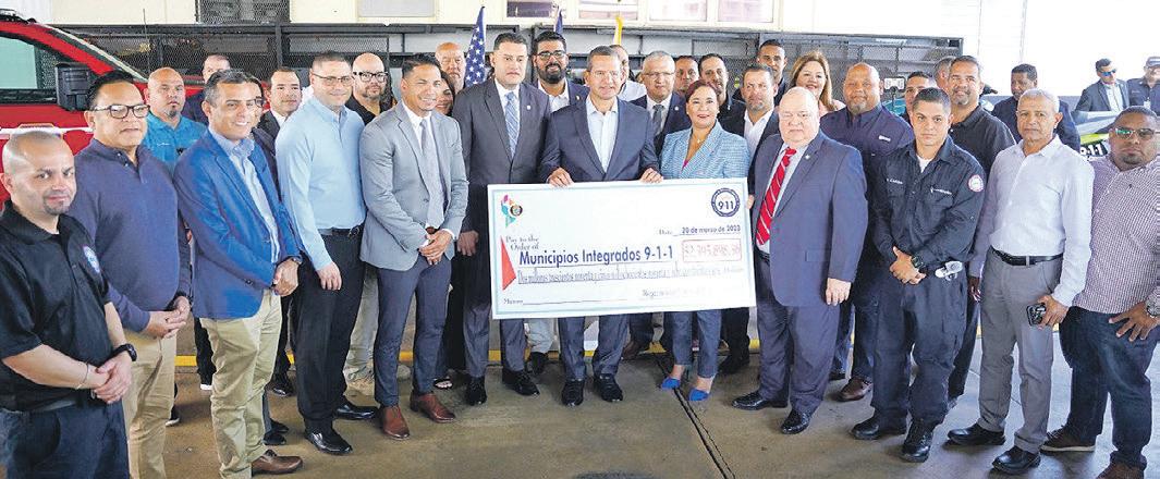 El gobernador Pedro Pierluisi muestra el cheque simbólico de los fondos distribuidos entre los municipios integrados al sistema 9-1-1. Lo acompañan los funcionarios de los centros 9-1-1 beneficiados.