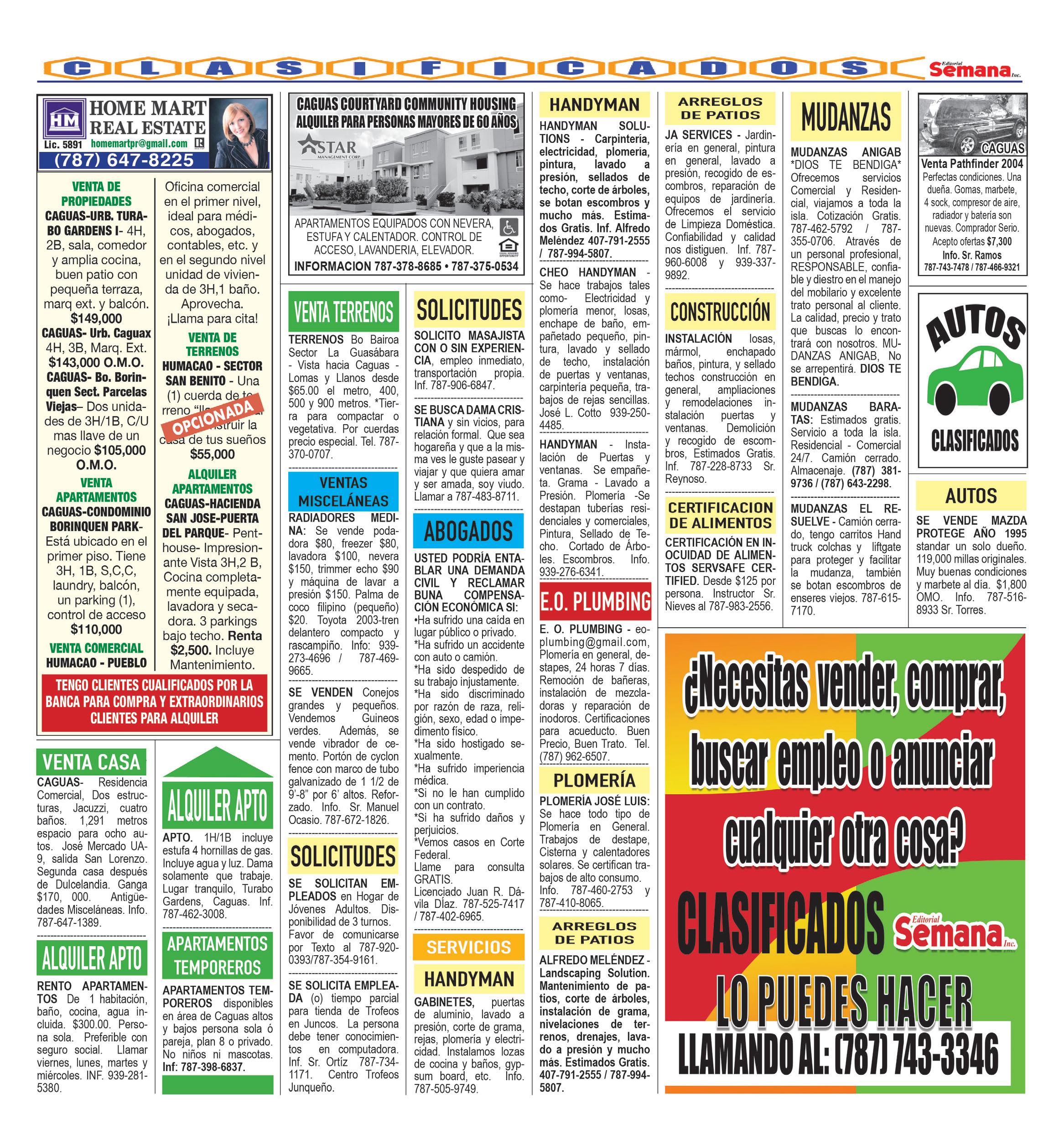 AUTOS •Mecánica General •Diagnostico con Scanner •Cambio de Aceite y Filtro •Radiadores Ave. Dr. Goyco Frente a Parque de Bombas en Caguas 787-586-0999 Abierto L-S 8:00 AM a 5:00 PM Servicio Automotriz JAS HACEMOS TODO TIPO DE CONSTRUCCIÓN •Marquesinas •Verjas •Remodelaciones •Pintura •Selado de techo •Terraza •Hacemos puertas y ventanas •ESTIMADOS GRATIS• 787-310-6373 Si el techo de Su caSa tiene filtracioneS, noSotroS tenemoS la Solución SINGLE PLY P.V.C.