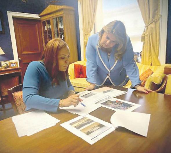 La alcaldesa Rosachely Rivera Santana discute el proyecto con la comisionada residente, Jenniffer González Colón, previo a la reunión virtual con USACE.