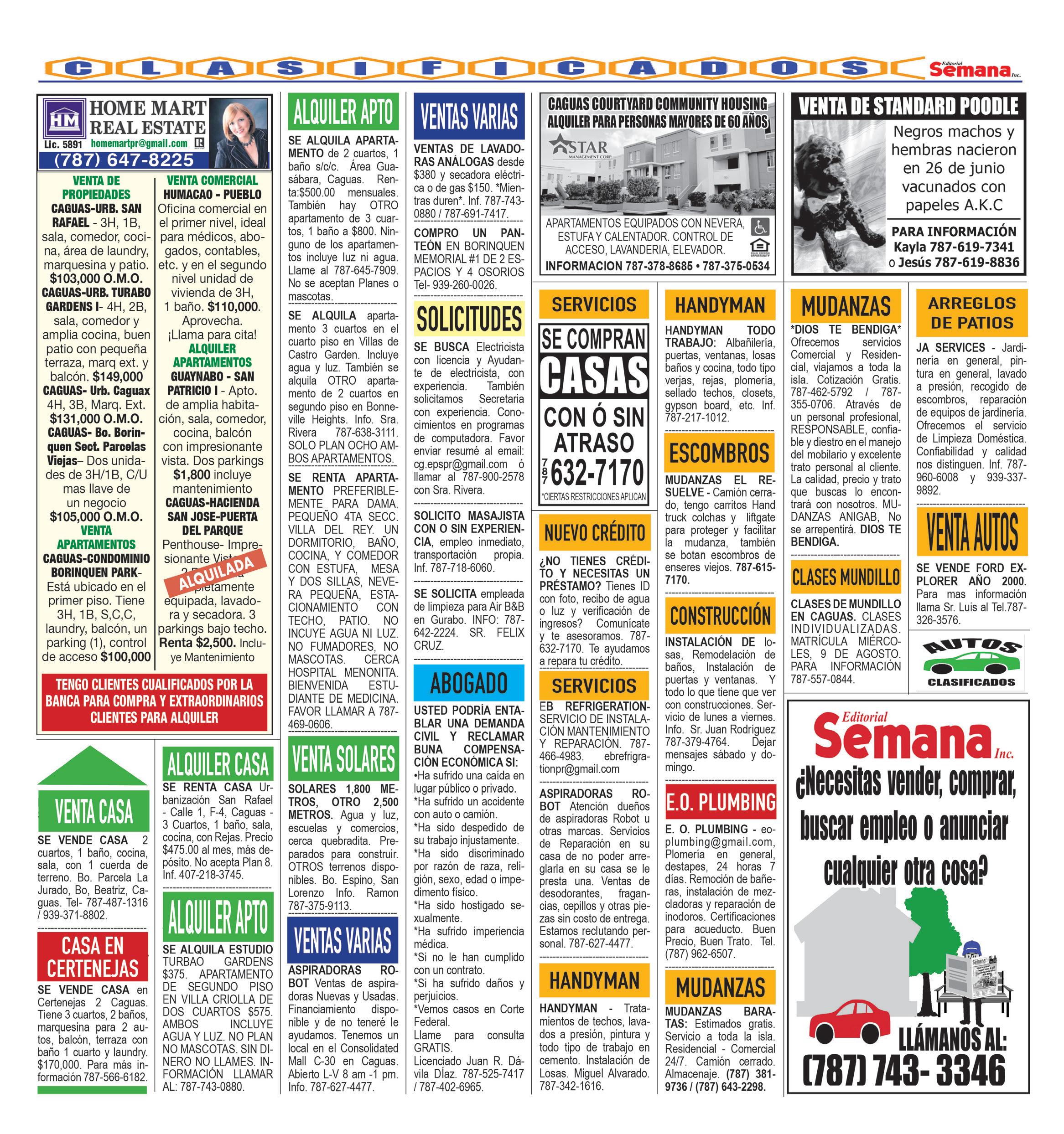 CUBRIENDO LOS PUEBLOS DE Caguas • Humacao Gurabo • Juncos • Las Piedras San Lorenzo • Naguabo Yabucoa • Cayey • Cidra Aguas Buenas EDITORIAL SEMANA, INC. PUBLICADO SEMANALMENTE POR Editorial Semana, Inc. PO Box 6537 Caguas, PR. 00726 E-Mail noticias: redaccion@periodicolasemana.net E-Mail general: lasemanaelpionero@gmail.com www.periodicolasemana.net Editorial Semana DIRECTORA DE VENTAS: Lisette Martínez DIRECTOR EDITORIAL: José Javier Aponte Parsi DIRECTOR DE PRODUCCIÓN: Manuel Sierra Burgos DIRECTOR DE CIRCULACIÓN: Manuel Ortiz Pedraza DIRECTORA CUENTAS POR PAGAR: María de L. Márquez Telefonos 787.743.3346 787.743.6637 • 787.743.5606 •Agencias de Publicidad 787.744.7910 Servicios y Autos.....32-34 Clasificados.................35 Deportes.................37-39 Directorio Legal.............24 Medicina..................28-31 Obituarios................36-37